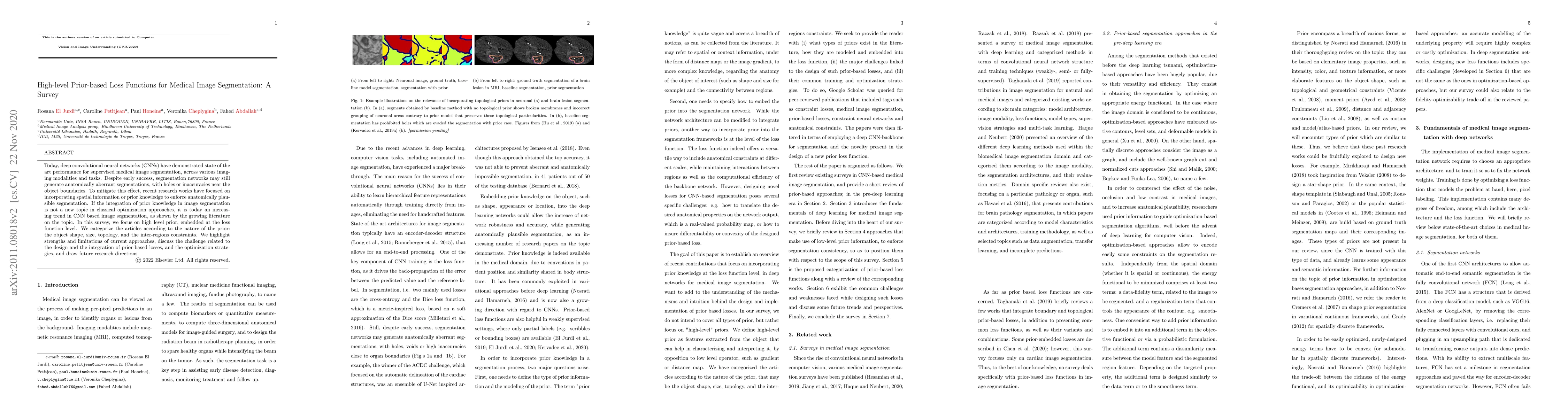 This survey examines recent advancements in incorporating high-level priors into loss functions to improve medical image segmentation using deep CNNs. It categorizes and analyzes various priors, discusses their strengths and limitations, and outlines future research directions for integrating anatomically plausible priors into segmentation networks.