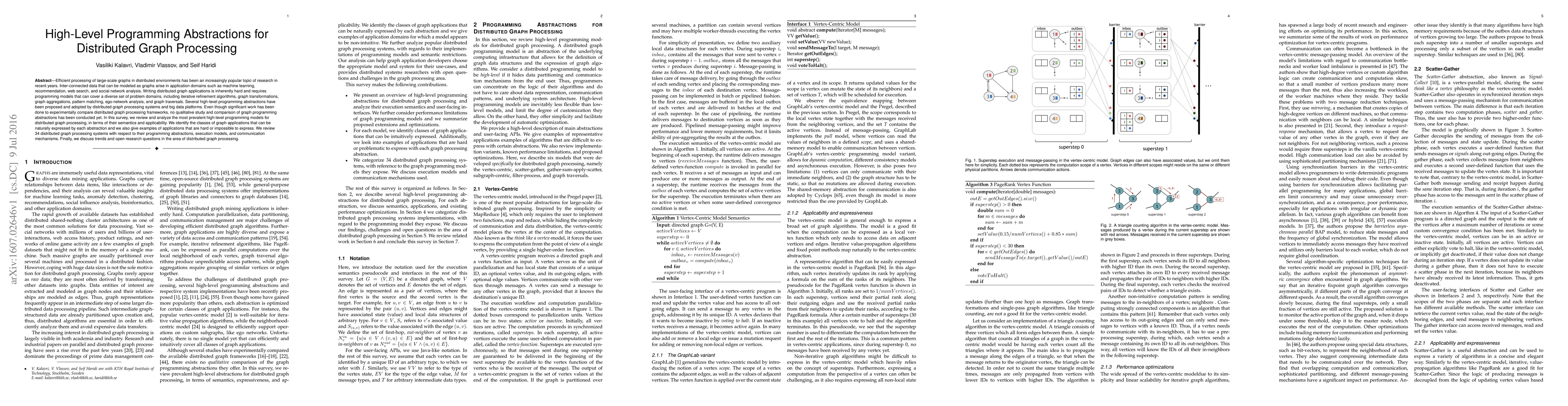 This paper surveys high-level programming abstractions for distributed graph processing, analyzing their semantics and applicability across various graph applications. It reviews 34 systems, identifying strengths and limitations of each abstraction and discussing trends and open research questions in the field.
