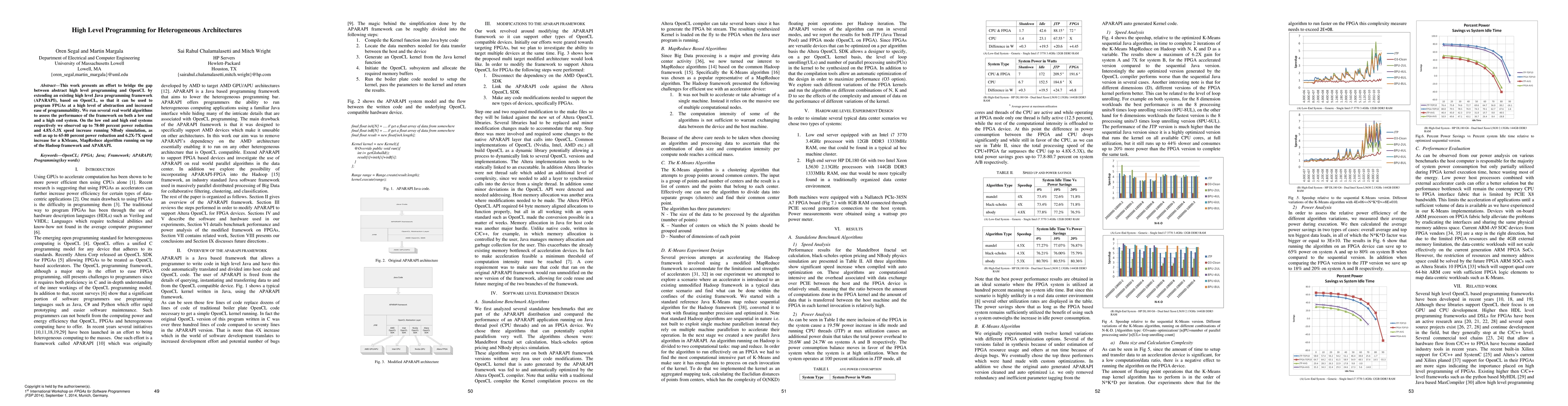 This work presents an effort to bridge the gap between abstract high level programming and OpenCL by extending an existing high level Java programming framework (APARAPI), based on OpenCL, so that it can be used to program FPGAs at a high level of abstraction and increased ease of programmability. We run several real world algorithms to assess the performance of the framework on both a low end and a high end system. On the low end and high end systems respectively we observed up to 78-80 percent power reduction and 4.8X-5.3X speed increase running NBody simulation, as well as up to 65-80 percent power reduction and 6.2X-7X speed increase for a KMeans, MapReduce algorithm running on top of the Hadoop framework and APARAPI.