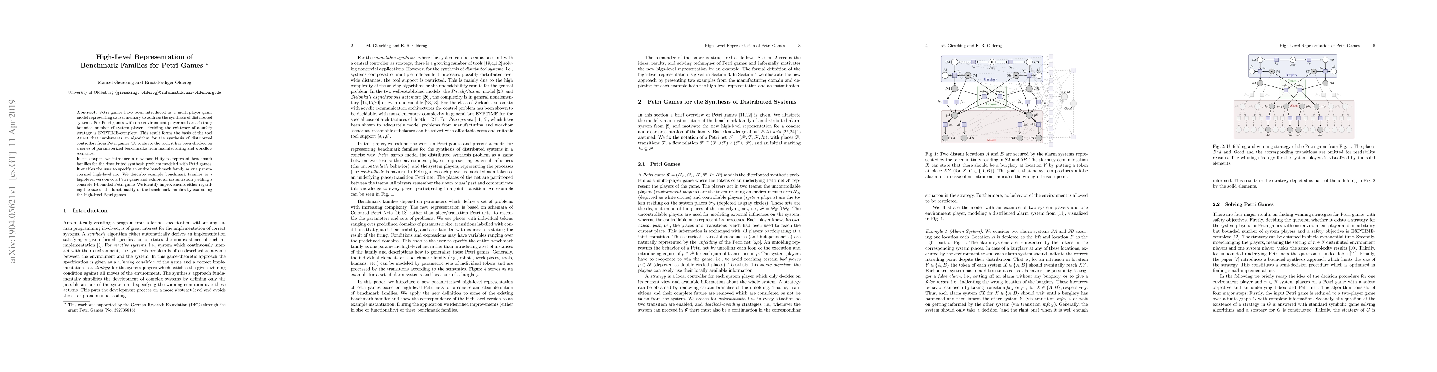 Petri games have been introduced as a multi-player game model representing causal memory to address the synthesis of distributed systems. For Petri games with one environment player and an arbitrary bounded number of system players, deciding the existence of a safety strategy is EXPTIME-complete. This result forms the basis of the tool ADAM that implements an algorithm for the synthesis of distributed controllers from Petri games. To evaluate the tool, it has been checked on a series of parameterized benchmarks from manufacturing and workflow scenarios. In this paper, we introduce a new possibility to represent benchmark families for the distributed synthesis problem modeled with Petri games. It enables the user to specify an entire benchmark family as one parameterized high-level net. We describe example benchmark families as a high-level version of a Petri game and exhibit an instantiation yielding a concrete 1-bounded Petri game. We identify improvements either regarding the size or the functionality of the benchmark families by examining the high-level Petri games.
