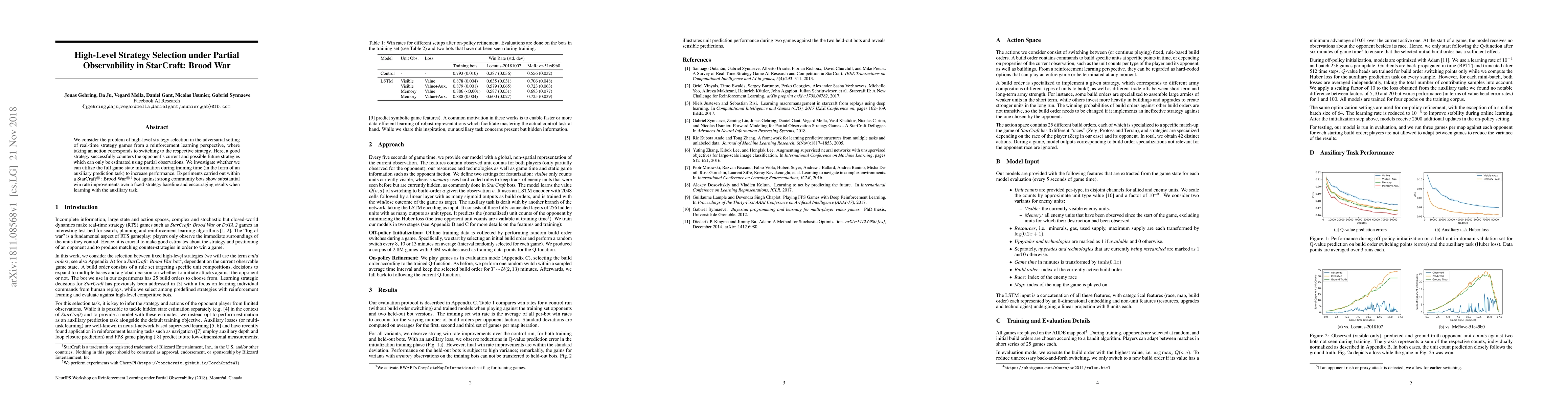We consider the problem of high-level strategy selection in the adversarial setting of real-time strategy games from a reinforcement learning perspective, where taking an action corresponds to switching to the respective strategy. Here, a good strategy successfully counters the opponent's current and possible future strategies which can only be estimated using partial observations. We investigate whether we can utilize the full game state information during training time (in the form of an auxiliary prediction task) to increase performance. Experiments carried out within a StarCraft: Brood War bot against strong community bots show substantial win rate improvements over a fixed-strategy baseline and encouraging results when learning with the auxiliary task.