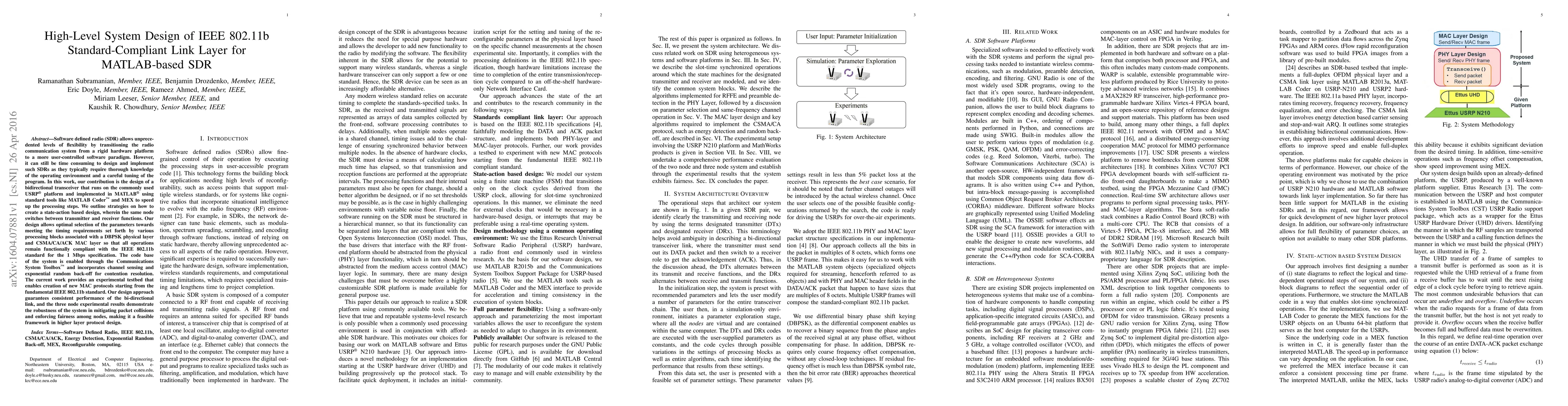 This paper presents a MATLAB-based high-level system design for an IEEE 802.11b compliant bidirectional transceiver on the USRP platform, utilizing MATLAB Coder and MEX for efficient processing. The design ensures compliance with the IEEE 802.11b standard and demonstrates robust performance in mitigating packet collisions and enforcing fairness among nodes.