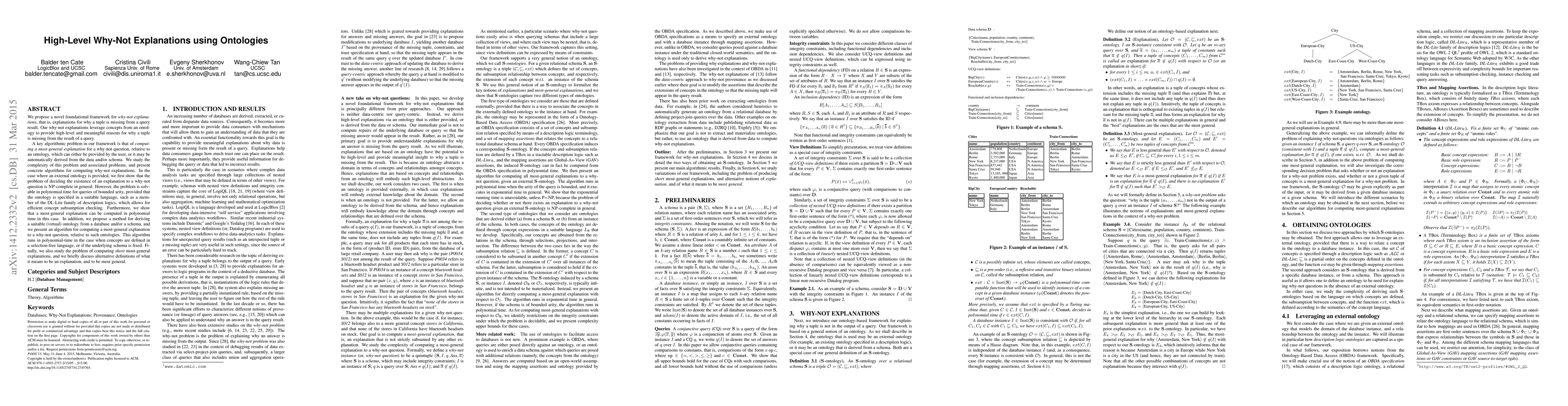 This paper introduces a framework for generating high-level "why-not" explanations using ontologies to elucidate missing tuples from query results. It proposes algorithms for computing most-general explanations, demonstrating polynomial-time solutions for specific ontology languages and conditions, and explores the derivation of suitable ontologies from databases.