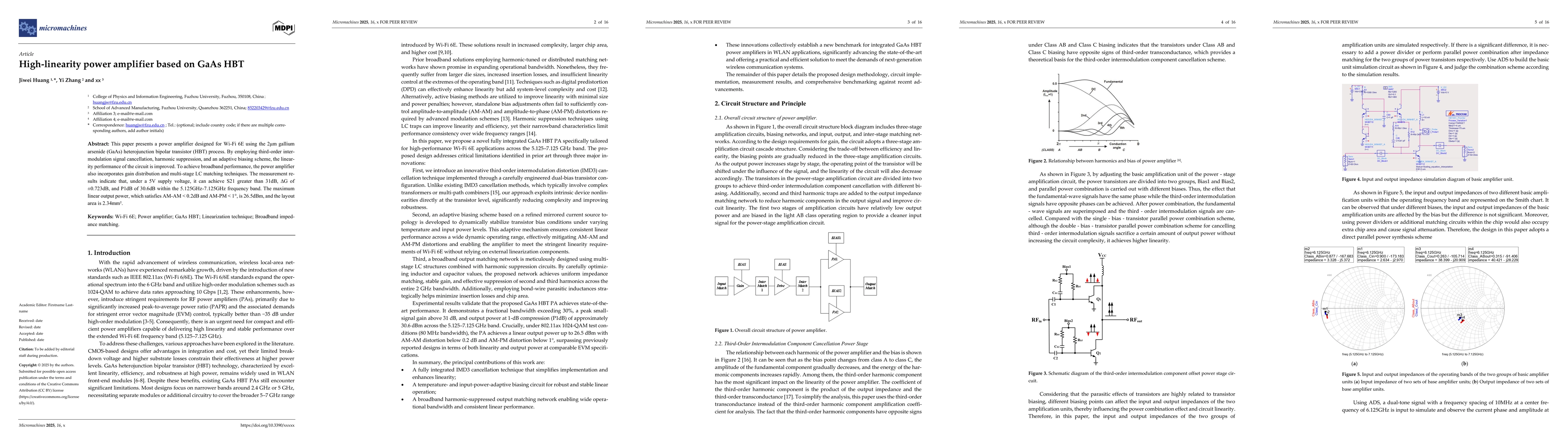The paper describes the design of a power amplifier for Wi-Fi 6E using a 2 µm GaAs HBT process, incorporating third-order inter-modulation signal cancellation, harmonic suppression, adaptive biasing, gain distribution, and multi-stage LC matching techniques.