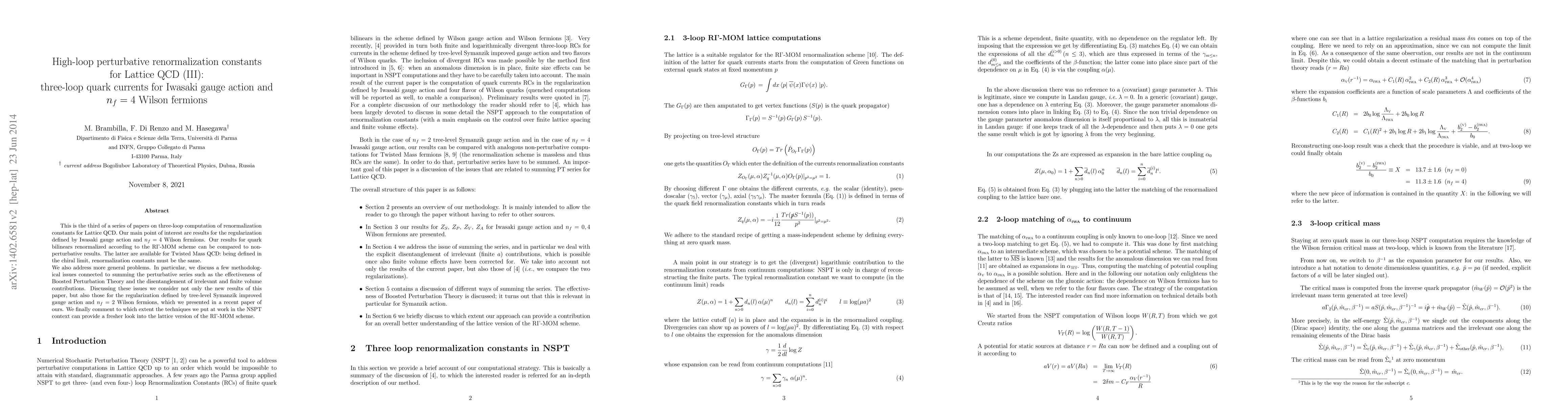 This is the third of a series of papers on three-loop computation of renormalization constants for Lattice QCD. Our main point of interest are results for the regularization defined by Iwasaki gauge action and n_f=4 Wilson fermions. Our results for quark bilinears renormalized according to the RI'-MOM scheme can be compared to non-perturbative results. The latter are available for Twisted Mass QCD: being defined in the chiral limit, renormalization constants must be the same. We also address more general problems. In particular, we discuss a few methodological issues connected to summing the perturbative series such as the effectiveness of Boosted Perturbation Theory and the disentanglement of irrelevant and finite volume contributions. Discussing these issues we consider ont only the new results of this paper, but also those for the regularization defined by tree-level Symanzik improved gauge action and n_f=2 Wilson fermions, which we presented in a recent paper of ours. We finally comment to which extent the techniques we put at work in the NSPT context can provide a fresher look into the lattice version of the RI'-MOM scheme.