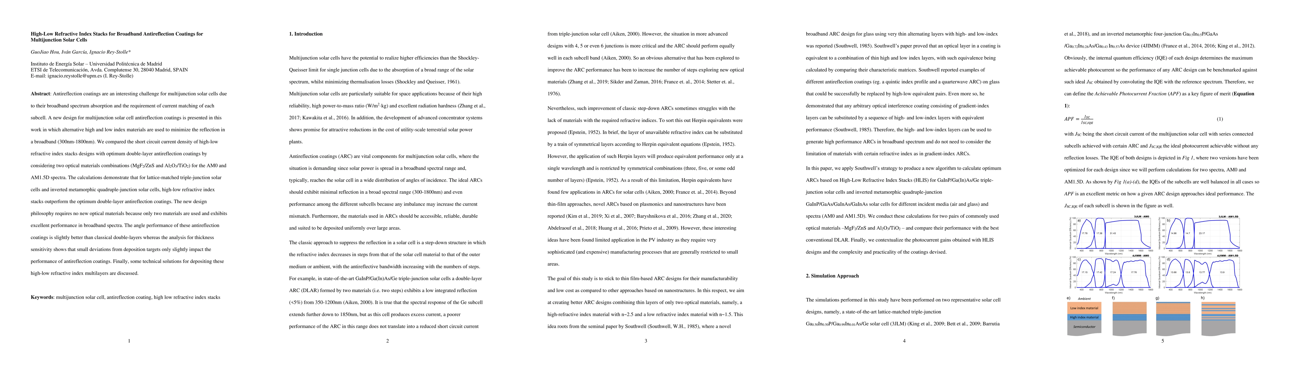 This paper presents a new design for broadband antireflection coatings using high-low refractive index stacks for multijunction solar cells, showing superior performance over traditional double-layer coatings in terms of short circuit current density and angle performance. The design utilizes only two optical materials, demonstrating excellent performance across a broad spectrum.