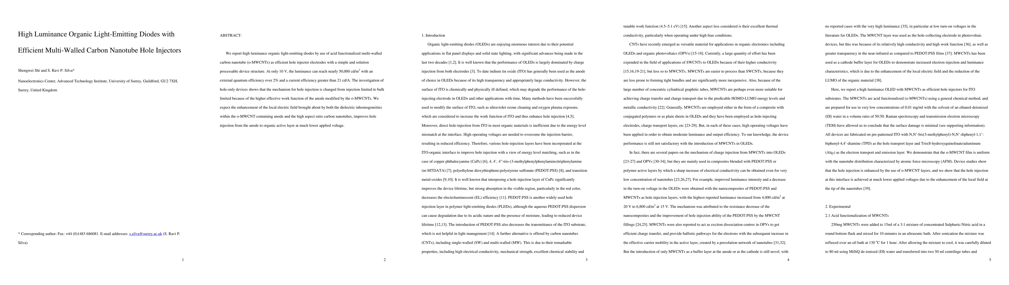 This paper reports high luminance organic light-emitting diodes (OLEDs) utilizing acid functionalized multi-walled carbon nanotubes as efficient hole injectors, achieving nearly 50,000 cd/m² at 10 V. The enhanced hole injection mechanism shifts from injection limited to bulk limited due to the higher effective work function of the modified anode.