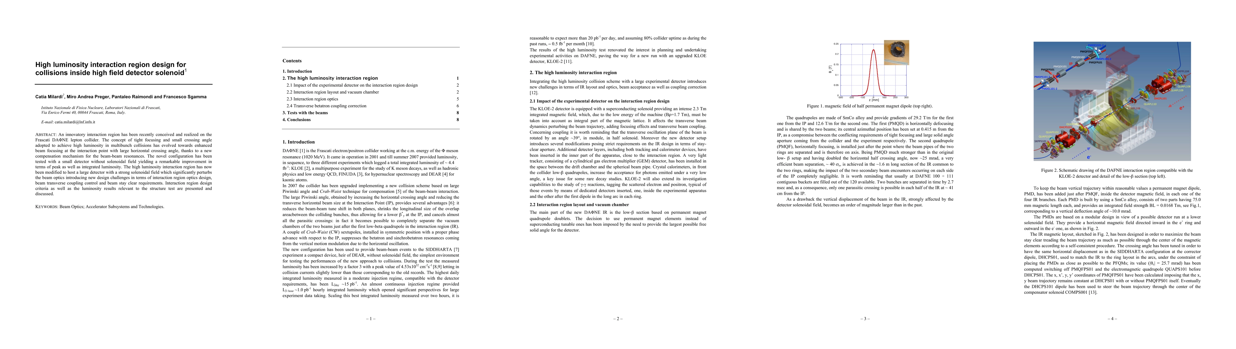An innovatory interaction region has been recently conceived and realized on the Frascati DA{\Phi}NE lepton collider. The concept of tight focusing and small crossing angle adopted to achieve high luminosity in multibunch collisions has evolved towards enhanced beam focusing at the interaction point with large horizontal crossing angle, thanks to a new compensation mechanism for the beam-beam resonances. The novel configuration has been tested with a small detector without solenoidal field yielding a remarkable improvement in terms of peak as well as integrated luminosity. The high luminosity interaction region has now been modified to host a large detector with a strong solenoidal field which significantly perturbs the beam optics introducing new design challenges in terms of interaction region optics design, beam transverse coupling control and beam stay clear requirements. Interaction region design criteria as well as the luminosity results relevant to the structure test are presented and discussed.