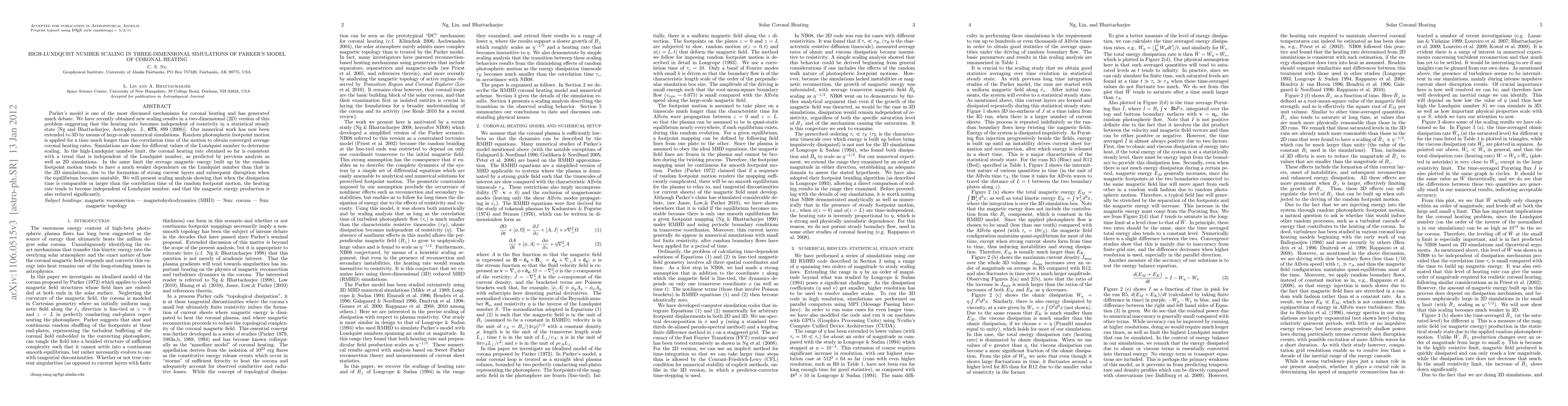 This paper extends 2D simulations of Parker's coronal heating model to 3D, revealing that in the high-Lundquist number regime, the heating rate becomes independent of resistivity, consistent with previous 2D findings and predictions. The magnetic energy buildup shows a weaker dependence on the Lundquist number in 3D due to the formation and disruption of current layers.