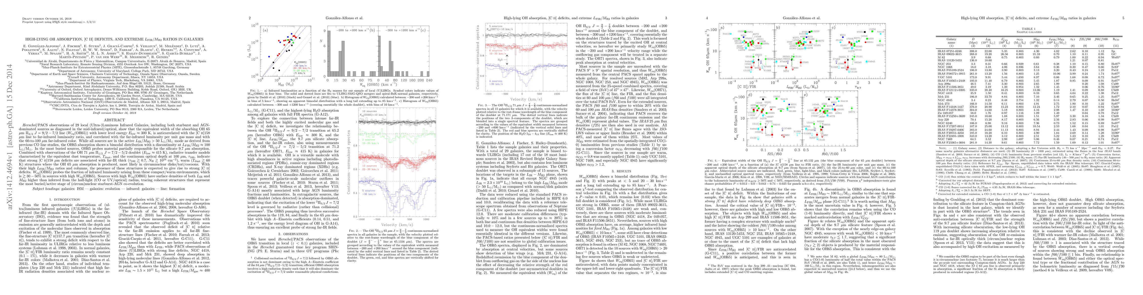 Herschel/PACS observations of 29 local (Ultra-)Luminous Infrared Galaxies, including both starburst and AGN-dominated sources as diagnosed in the mid-infrared/optical, show that the equivalent width of the absorbing OH 65 um Pi_{3/2} J=9/2-7/2 line (W_{eq}(OH65)) with lower level energy E_{low}~300 K, is anticorrelated with the [C ii]158 um line to far-infrared luminosity ratio, and correlated with the far-infrared luminosity per unit gas mass and with the 60-to-100 um far-infrared color. While all sources are in the active L_{IR}/M_{H2}>50 Lsun/Msun mode as derived from previous CO line studies, the OH65 absorption shows a bimodal distribution with a discontinuity at L_{FIR}/M_{H2}~100 Lsun/Msun. In the most buried sources, OH65 probes material partially responsible for the silicate 9.7 um absorption. Combined with observations of the OH 71 um Pi_{1/2} J=7/2-5/2 doublet (E_{low}~415 K), radiative transfer models characterized by the equivalent dust temperature, Tdust, and the continuum optical depth at 100 um, tau_{100}, indicate that strong [C ii]158 um deficits are associated with far-IR thick (tau_{100}>~0.7, N_{H}>~10^{24} cm^{-2}), warm (Tdust>~60 K) structures where the OH 65 um absorption is produced, most likely in circumnuclear disks/tori/cocoons. With their high L_{FIR}/M_{H2} ratios and columns, the presence of these structures is expected to give rise to strong [C ii] deficits. W_{eq}(OH65) probes the fraction of infrared luminosity arising from these compact/warm environments, which is >~30-50% in sources with high W_{eq}({OH65}). Sources with high W_{eq}({OH65}) have surface densities of both L_{IR} and M_{H2} higher than inferred from the half-light (CO or UV/optical) radius, tracing coherent structures that represent the most buried/active stage of (circum)nuclear starburst-AGN co-evolution.