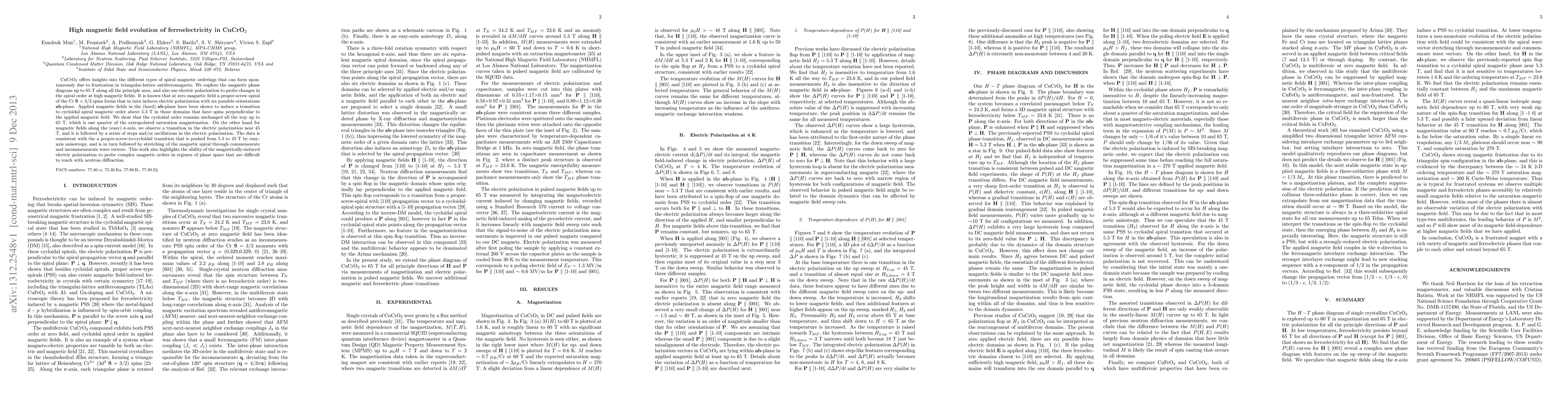 CuCrO2 offers insights into the different types of spiral magnetic orderings that can form spontaneously due to frustration in triangular-lattice antiferromagnets. We explore the magnetic phase diagram up to 65 T along all the principle axes, and also use electric polarization to probe changes in the spiral order at high magnetic fields. It is known that at zero magnetic field a proper-screw spiral of the Cr S = 3/2 spins forms that in turn induces electric polarization with six possible orientations ab-plane. Applied magnetic fields in the (hard) ab-plane have been shown to induce a transition to cycloidal spiral magnetic order above 5.3 T in those domains that have spins perpendicular to the applied magnetic field. We show that the cycloidal order remains unchanged all the way up to 65 T, which is one quarter of the extrapolated saturation magnetization. On the other hand for magnetic fields along the (easy) c-axis, we observe a transition in the electric polarization near 45 T, and it is followed by a series of steps and/or oscillations in the electric polarization. The data is consistent with the a proper-screw-to-cycloidal transition that is pushed from 5.3 to 45 T by easy-axis anisotropy, and is in turn followed by stretching of the magnetic spiral through commensurate and incommensurate wave vectors. This work also highlights the ability of the magnetically-induced electric polarization to probe complex magnetic orders in regimes of phase space that are difficult to reach with neutron diffraction.
