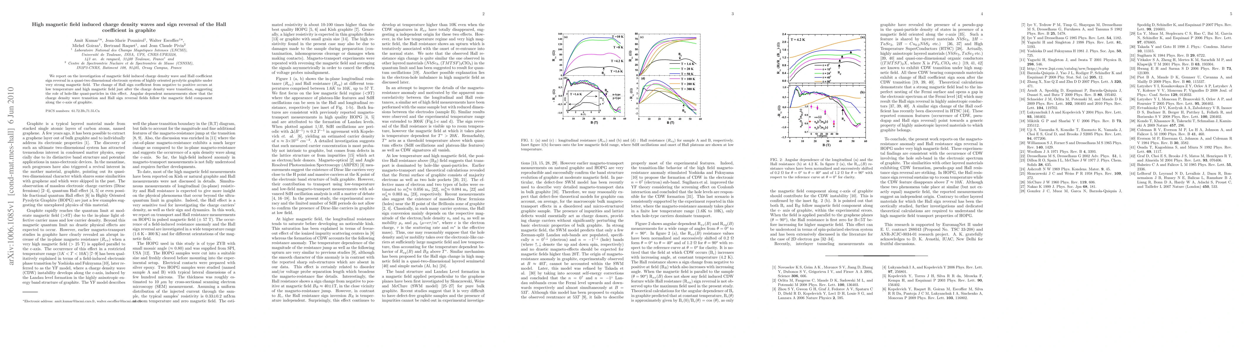 Summary: This study investigates the formation of magnetic field-induced charge density waves and the sign reversal of the Hall coefficient in highly oriented pyrolytic graphite under strong magnetic fields. The transition from negative to positive Hall coefficient occurs at low temperatures and high magnetic fields, indicating the influence of hole-like quasi-particles. Measurements reveal that both phenomena are dependent on the magnetic field component along the c-axis.