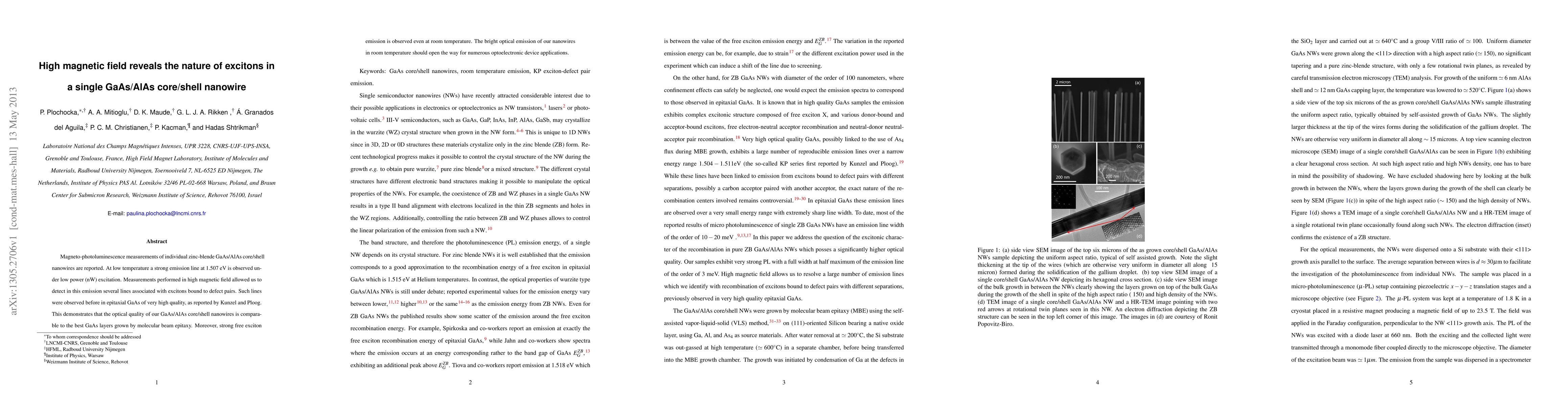 This study reveals the nature of excitons in GaAs/AlAs core/shell nanowires through magneto-photoluminescence, showing high-quality optical properties comparable to the best GaAs layers. The nanowires exhibit strong free exciton emission at room temperature, indicating potential for optoelectronic applications.