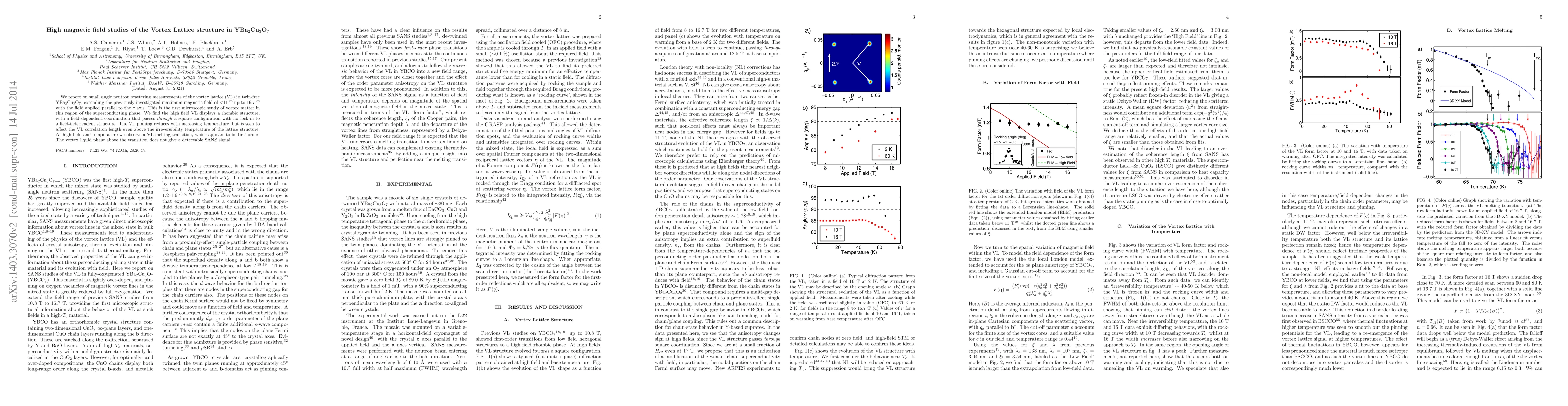 We report on small angle neutron scattering measurements of the vortex lattice in twin-free YBa2Cu3O7, extending the previously investigated maximum field of 11~T up to 16.7~T with the field applied parallel to the c axis. This is the first microscopic study of vortex matter in this region of the superconducting phase. We find the high field VL displays a rhombic structure, with a field-dependent coordination that passes through a square configuration, and which does not lock-in to a field-independent structure. The VL pinning reduces with increasing temperature, but is seen to affect the VL correlation length even above the irreversibility temperature of the lattice structure. At high field and temperature we observe a melting transition, which appears to be first order, with no detectable signal from a vortex liquid above the transition.