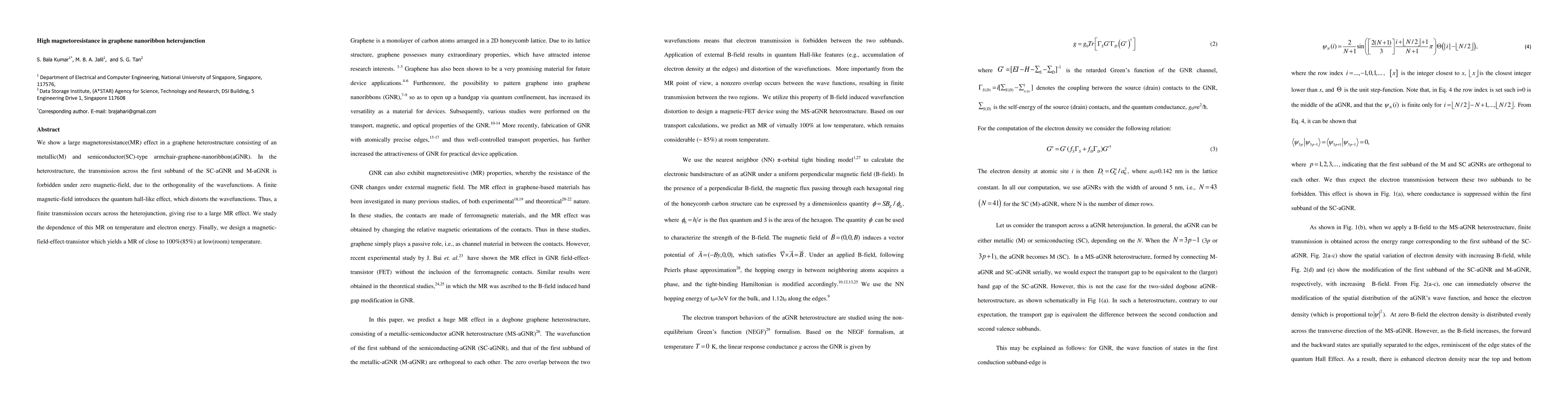 We show a large magnetoresistance(MR) effect in a graphene heterostructure consisting of an metallic(M) and semiconductor(SC)-type armchair-graphene-nanoribbon(aGNR). In the heterostructure, the transmission across the first subband of the SC-aGNR and M-aGNR is forbidden under zero magnetic-field, due to the orthogonality of the wavefunctions. A finite magnetic-field introduces the quantum hall-like effect, which distorts the wavefunctions. Thus, a finite transmission occurs across the heterojunction, giving rise to a large MR effect. We study the dependence of this MR on temperature and electron energy. Finally, we design a magnetic-field-effect-transistor which yields a MR of close to 100%(85%) at low(room) temperature.