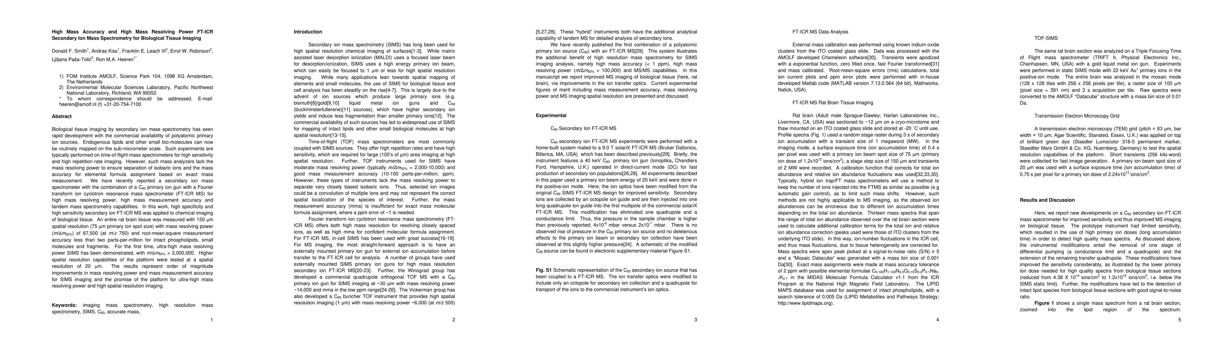 This paper demonstrates the application of high mass accuracy and high mass resolving power FT-ICR secondary ion mass spectrometry (SIMS) for biological tissue imaging, achieving unprecedented resolution and accuracy in mapping endogenous lipids and small bio-molecules in rat brain tissue. The platform shows significant improvements in mass resolving power and measurement accuracy, promising advanced imaging capabilities.