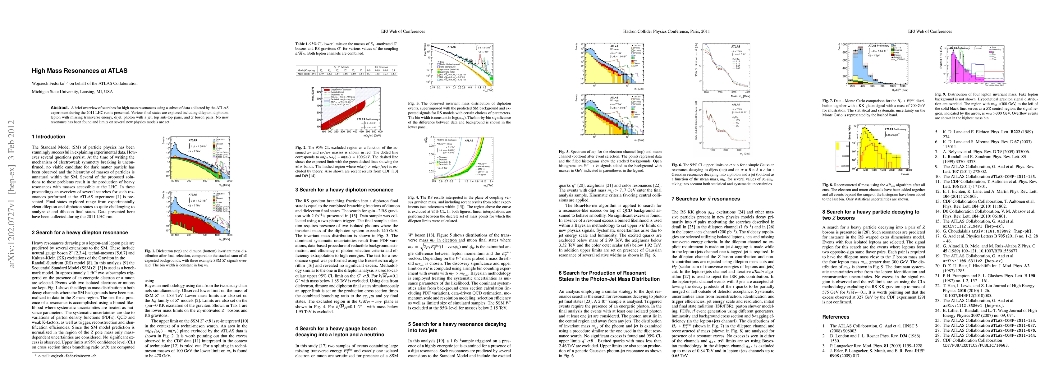 The ATLAS experiment analyzed data from the 2011 LHC run to search for high mass resonances across various final states, but no new resonances were found, leading to new limits on several theoretical models.