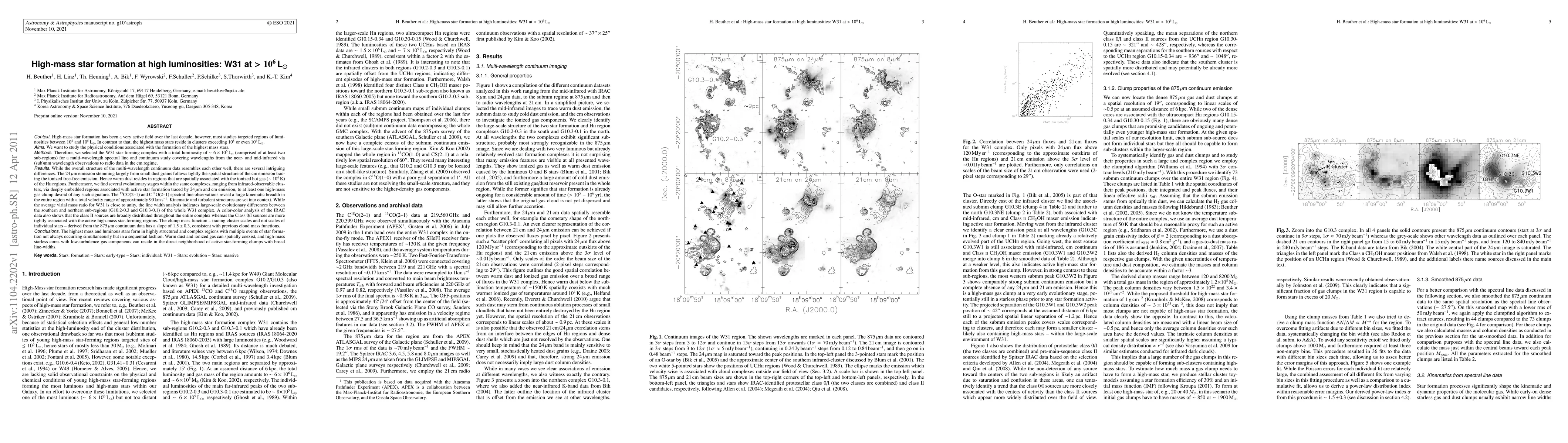Context: High-mass star formation has been a very active field over the last decade, however, most studies targeted regions of luminosities between 10^4 and 10^5 L_sun. Methods: We selected the W31 star-forming complex with a total luminosity of ~6x10^6 L_sun for a multi-wavelength spectral line and continuum study covering wavelengths from the near- and mid-infrared via (sub)mm wavelength observations to radio data in the cm regime. Results: While the overall structure of the multi-wavelength continuum data resembles each other well, there are several intriguing differences. The 24mum emission stemming largely from small dust grains follows tightly the spatial structure of the cm emission tracing the ionized free-free emission. Hence warm dust resides in regions that are spatially associated with the ionized hot gas (~10^4 K) of the HII regions. Furthermore, we find several evolutionary stages within the same complexes, ranging from infrared-observable clusters, via deeply embedded regions associated with active star formation traced by 24\,$\mu$m and cm emission, to at least one high-mass gas clump devoid of any such signature. The 13CO(2-1) and C18O(2-1) spectral line observations reveal a large kinematic breadth in the entire region with a total velocity range of approximately 90 km/s. While the average virial mass ratio for W31 is close to unity, the line width analysis indicates large-scale evolutionary differences between the southern and northern sub-regions (G10.2-0.3 and G10.3-0.1) of the whole W31 complex. The clump mass function - tracing cluster scales and not scales of individual stars - derived from the 875mum continuum data has a slope of 1.5+-0.3, consistent with previous cloud mass functions.