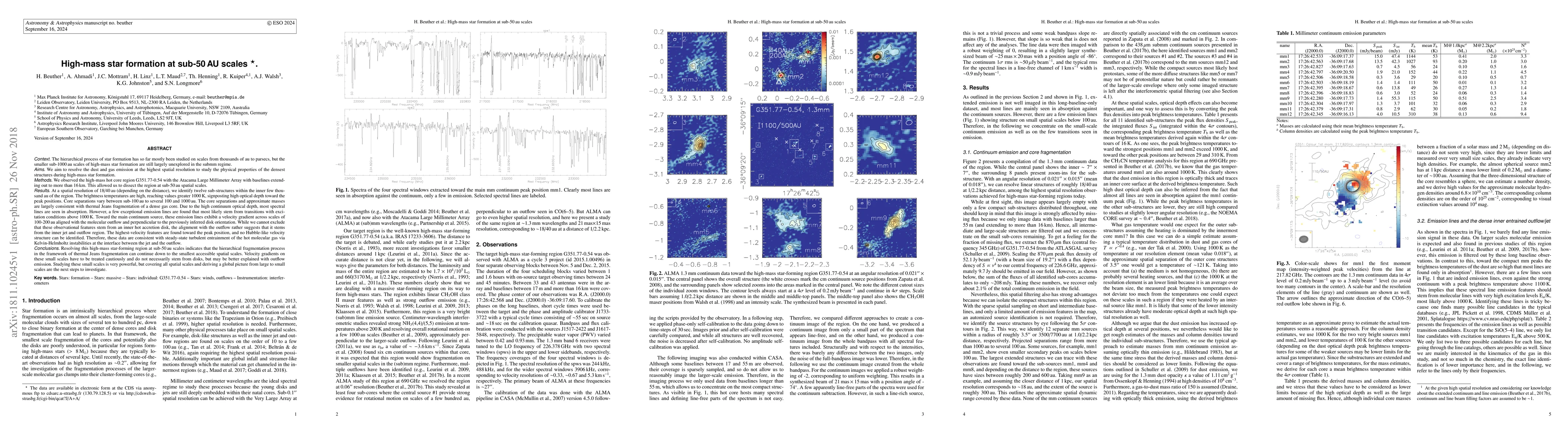 Methods: We observed the high-mass hot core region G351.77-0.54 with ALMA and more than 16km baselines. Results: At a spatial resolution of 18/40au (depending on the distance), we identify twelve sub-structures within the inner few thousand au of the region. The brightness temperatures are high, reaching values greater 1000K, signposting high optical depth toward the peak positions. Core separations vary between sub-100au to several 100 and 1000au. The core separations and approximate masses are largely consistent with thermal Jeans fragmentation of a dense gas core. Due to the high continuum optical depth, most spectral lines are seen in absorption. However, a few exceptional emission lines are found that most likely stem from transitions with excitation conditions above1000K. Toward the main continuum source, these emission lines exhibit a velocity gradient across scales of 100-200au aligned with the molecular outflow and perpendicular to the previously inferred disk orientation. While we cannot exclude that these observational features stem from an inner hot accretion disk, the alignment with the outflow rather suggests that it stems from the inner jet and outflow region. The highest-velocity features are found toward the peak position, and no Hubble-like velocity structure can be identified. Therefore, these data are consistent with steady-state turbulent entrainment of the hot molecular gas via Kelvin-Helmholtz instabilities at the interface between the jet and the outflow. Conclusions: Resolving this high-mass star-forming region at sub-50au scales indicates that the hierarchical fragmentation process in the framework of thermal Jeans fragmentation can continue down to the smallest accessible spatial scales. Velocity gradients on these small scales have to be treated cautiously and do not necessarily stem from disks, but may be better explained with outflow emission.