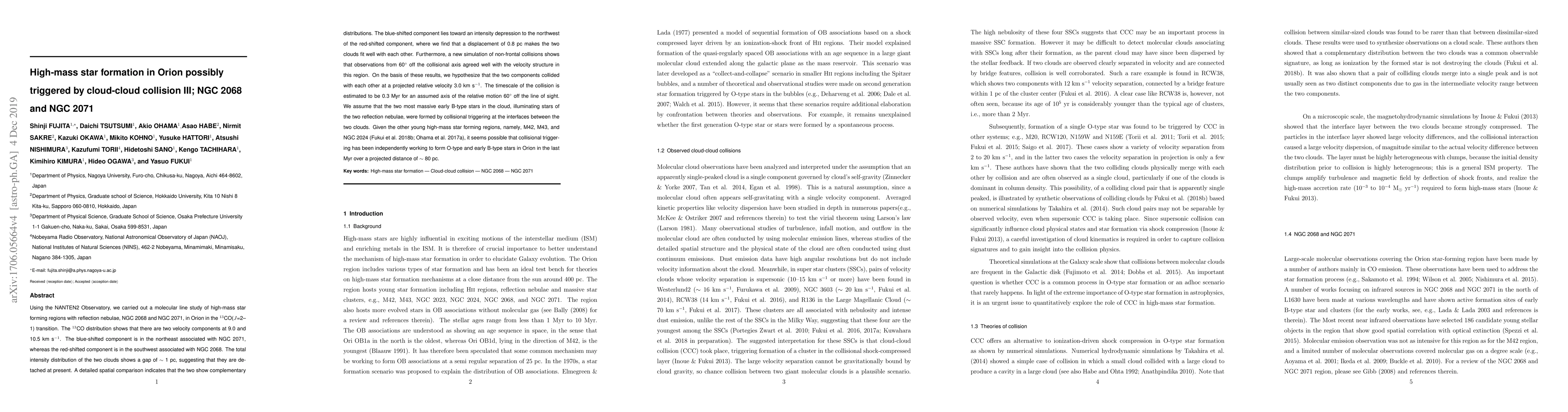 This study using the NANTEN2 Observatory suggests that the high-mass star formation in Orion's NGC 2068 and NGC 2071 regions may have been triggered by a cloud-cloud collision. The analysis indicates that these clouds, previously detached, likely collided at a relative velocity of 3.0 km/s, potentially initiating the formation of massive early B-type stars.