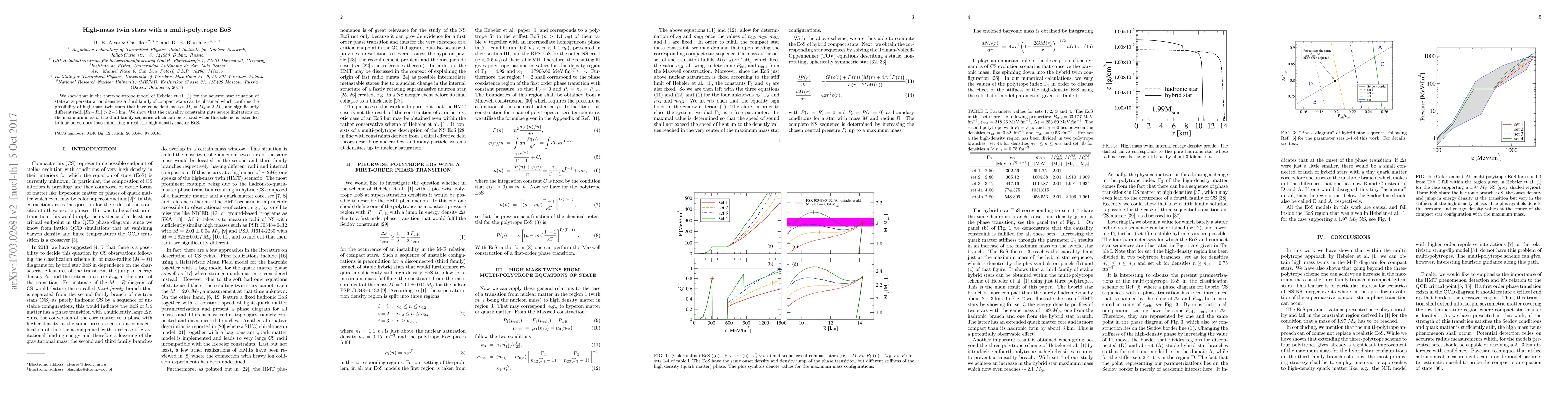 We show that in the 3-polytropes model of Hebeler et al. \cite{Hebeler:2013nza} for the neutron star equation of state at supersaturation densities a third family of compact stars can be obtained which confirms the possibility of high-mass twin stars that have coincident masses $M_1=M_2\approx 2~M_\odot$ and significantly different radii $|R_1-R_2|>2-3 $ km. We show that the causality constraint puts severe limitations on the maximum mass of the third family sequence which can be relaxed when this scheme is extended to four polytropes thus mimicking a realistic high-density matter EoS.