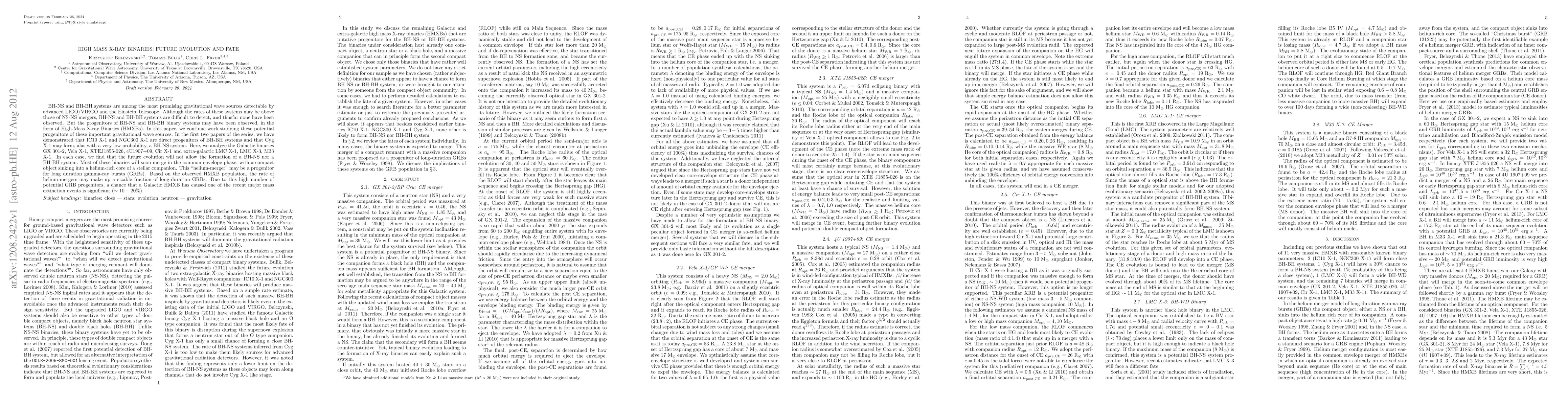 BH-NS and BH-BH systems are among the most promising gravitational wave sources detectable by advanced LIGO/VIRGO and the Einstein Telescope. Although the rates of these systems may be above those of NS-NS mergers, BH-NS and BH-BH systems are difficult to detect, and thusfar none have been observed. But the progenitors of BH-NS and BH-BH binary systems may have been observed, in the form of High-Mass X-ray Binaries (HMXBs). In this paper, we continue work studying these potential progenitors of these important gravitational wave sources. In the first two papers of the series, we have demonstrated that IC10 X-1 and NGC300 X-1 are direct progenitors of BH-BH systems and that Cyg X-1 may form, alas with a very low probability, a BH-NS system. Here, we analyze the Galactic binaries GX 301-2, Vela X-1, XTEJ1855-026, 4U1907+09, Cir X-1 and extra-galactic LMC X-1, LMC X-3, M33 X-1. In each case, we find that the future evolution will not allow the formation of a BH-NS nor a BH-BH system. Most of these binaries will soon merge in the common envelope phase, with a compact object sinking into a helium-rich core of a stellar companion. This "helium-merger" may be a progenitor for long duration gamma-ray bursts (GRBs). Based on the observed HMXB population, the rate of helium-mergers may make up a sizable fraction of long-duration GRBs. Due to this high number of potential GRB progenitors, a chance that a Galactic HMXB has caused one of the recent major mass extinction events is significant (10-20%).