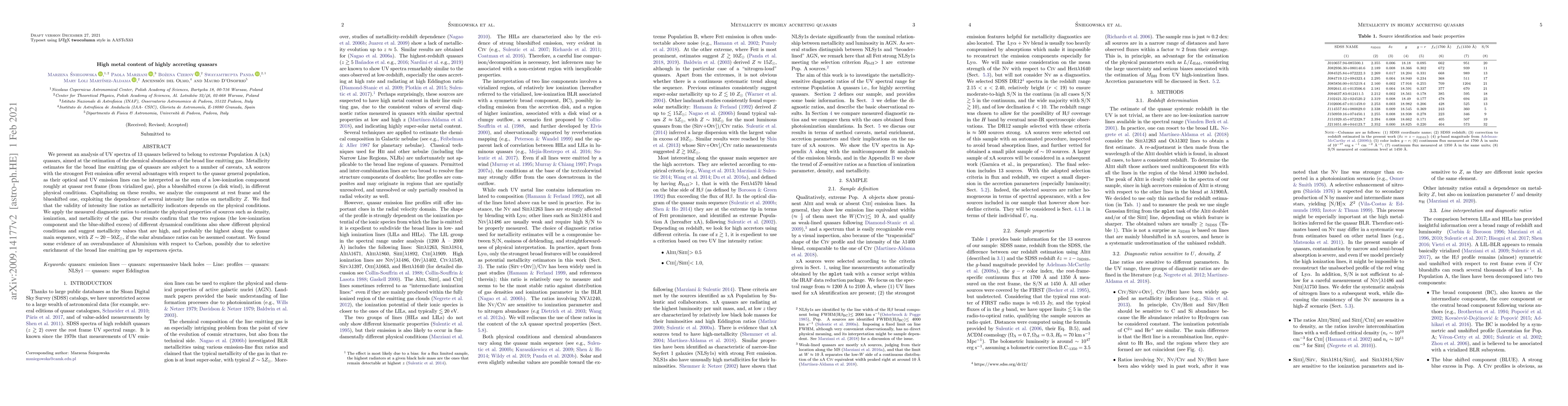 We present an analysis of UV spectra of 13 quasars believed to belong to extreme Population A (xA) quasars, aimed at the estimation of the chemical abundances of the broad line emitting gas. Metallicity estimates for the broad line emitting gas of quasars are subject to a number of caveats, although present data suggest the possibility of an increase along the quasar main sequence along with prominence of optical Fe II emission. Extreme Population A sources with the strongest Fe II emission offer several advantages with respect to the quasar general population, as their optical and UV emission lines can be interpreted as the sum of a low-ionization component roughly at quasar rest frame (from virialized gas), plus a blueshifted excess (a disk wind), in different physical conditions. Specifically, in terms of ionization parameter, cloud density, metallicity and column density. Capitalizing on these results, we analyze the component at rest frame and the blueshifted one, exploiting the dependence (of several intensity line ratios on metallicity $Z$). We find that the validity of intensity line ratios as metallicity indicators depends on the physical conditions. We apply the measured diagnostic ratios to estimate the physical properties of sources such as density, ionization, and metallicity of the gas. Our results confirm that the two regions (the low-ionization component and the blue-shifted excess) of different dynamical conditions also show different physical conditions and suggest metallicity values that are high, and probably the highest along the quasar main sequence, with $Z \gtrsim 10 Z_{\odot}$. We found some evidence of an overabundance of Aluminium with respect to Carbon, possibly due to selective enrichment of the broad line emitting gas by supernova ejecta.