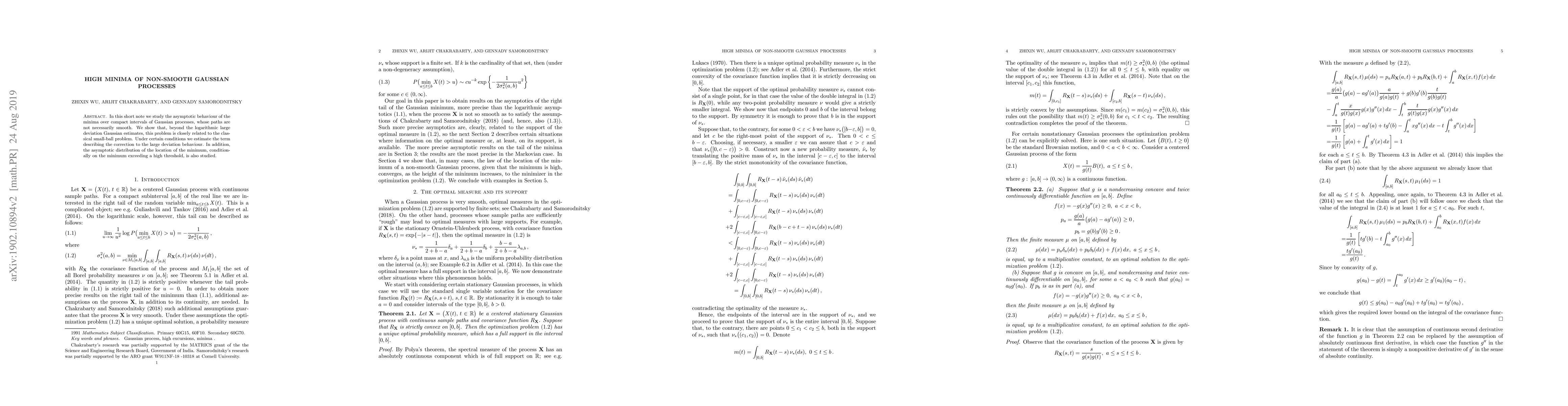 This paper investigates the asymptotic behavior of non-smooth Gaussian processes' minima over compact intervals, revealing a connection to the classical small-ball problem and estimating the correction term for large deviation behavior. It also examines the conditional asymptotic distribution of the minimum's location when it surpasses a high threshold.