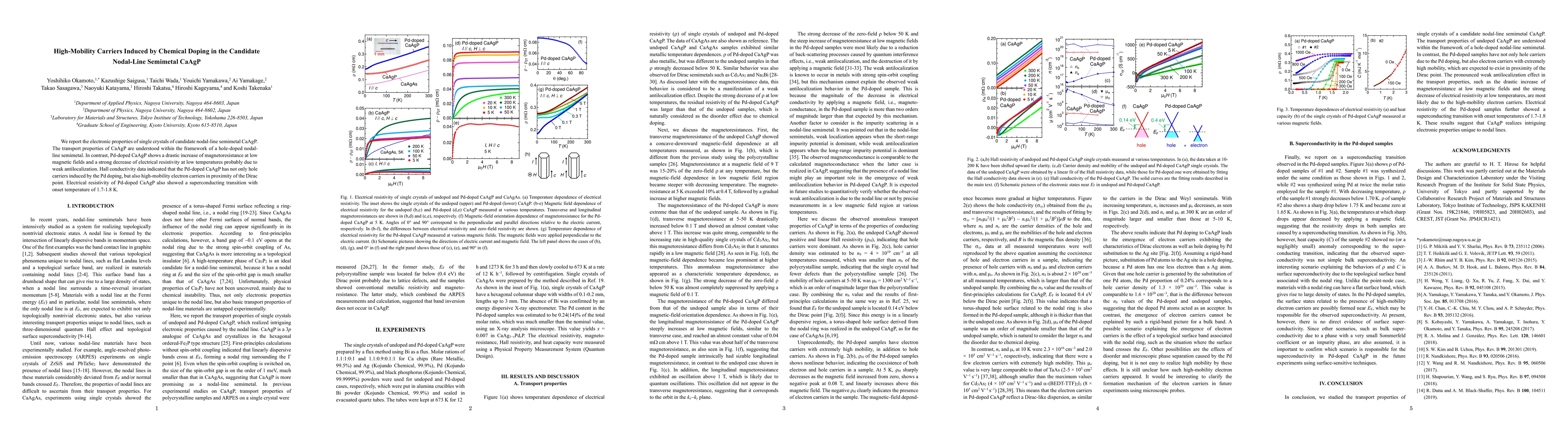 Researchers discovered that chemical doping with Pd in the nodal-line semimetal CaAgP results in significant magnetoresistance and superconducting transitions, attributed to high-mobility electron carriers near the Dirac point alongside hole carriers.
