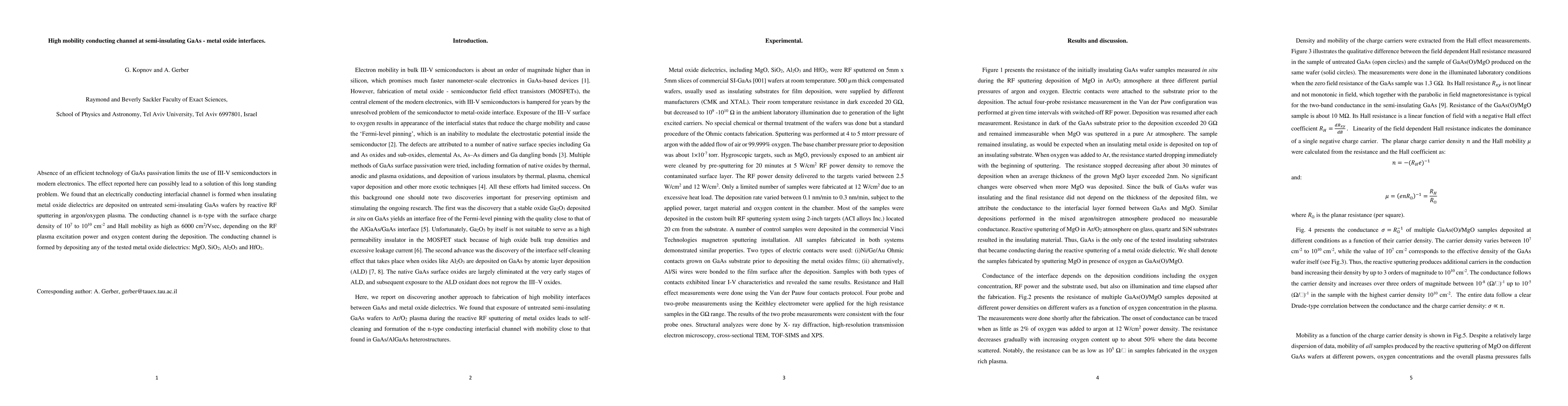 Absence of an efficient technology of GaAs passivation limits the use of III-V semiconductors in modern electronics. The effect reported here can possibly lead to a solution of this long standing problem. We found that an electrically conducting interfacial channel is formed when insulating metal oxide dielectrics are deposited on untreated semi-insulating GaAs wafers by reactive RF sputtering in argon/oxygen plasma. The conducting channel is n-type with the surface charge density of 10^7 to 10^10 cm^-2 and Hall mobility as high as 6000 cm^2/Vsec, depending on the RF plasma excitation power and oxygen content during the deposition. The conducting channel is formed by depositing any of the tested metal oxide dielectrics: MgO, SiO2, Al2O3 and HfO2.