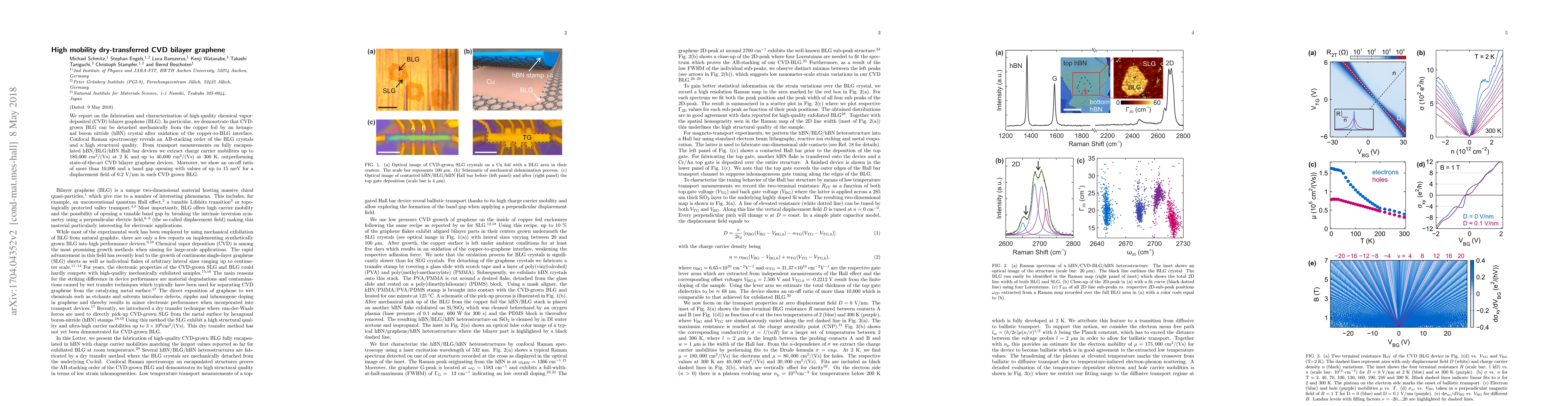 This research presents high-quality, dry-transferred CVD bilayer graphene with exceptional charge carrier mobility and high structural quality, achieved through an innovative mechanical detachment method using hexagonal boron nitride. The study reports charge carrier mobilities up to 180,000 cm$^2$/(Vs) at 2 K and superior on-off ratios exceeding 10,000.