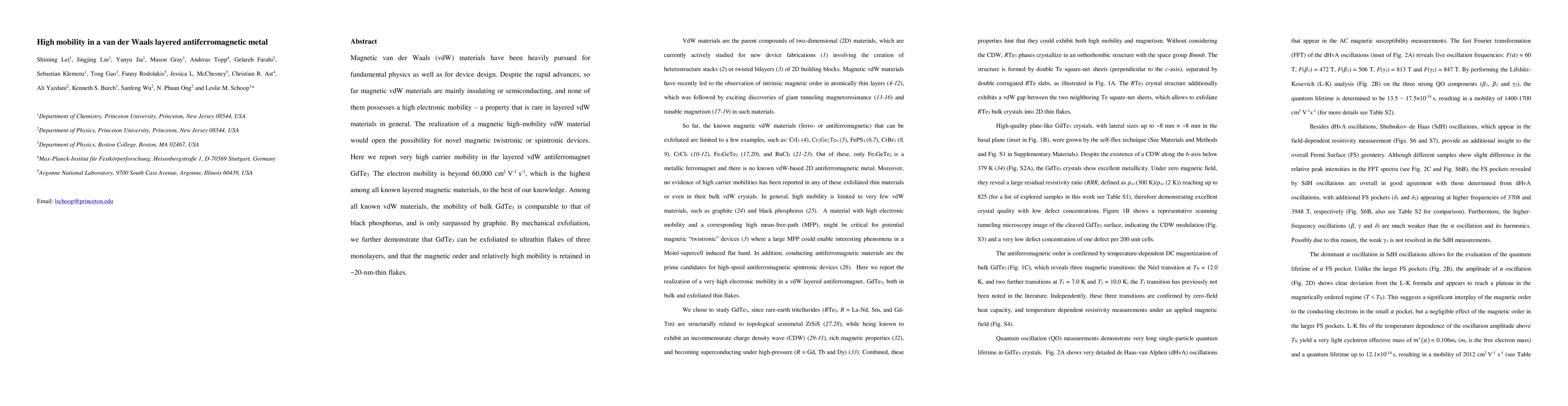 Magnetic van der Waals (vdW) materials have been heavily pursued for fundamental physics as well as for device design. Despite the rapid advances, so far magnetic vdW materials are mainly insulating or semiconducting, and none of them possesses a high electronic mobility - a property that is rare in layered vdW materials in general. The realization of a magnetic high-mobility vdW material would open the possibility for novel magnetic twistronic or spintronic devices. Here we report very high carrier mobility in the layered vdW antiferromagnet GdTe3. The electron mobility is beyond 60,000 cm2 V-1 s-1, which is the highest among all known layered magnetic materials, to the best of our knowledge. Among all known vdW materials, the mobility of bulk GdTe3 is comparable to that of black phosphorus, and is only surpassed by graphite. By mechanical exfoliation, we further demonstrate that GdTe3 can be exfoliated to ultrathin flakes of three monolayers, and that the magnetic order and relatively high mobility is retained in approximately 20-nm-thin flakes.