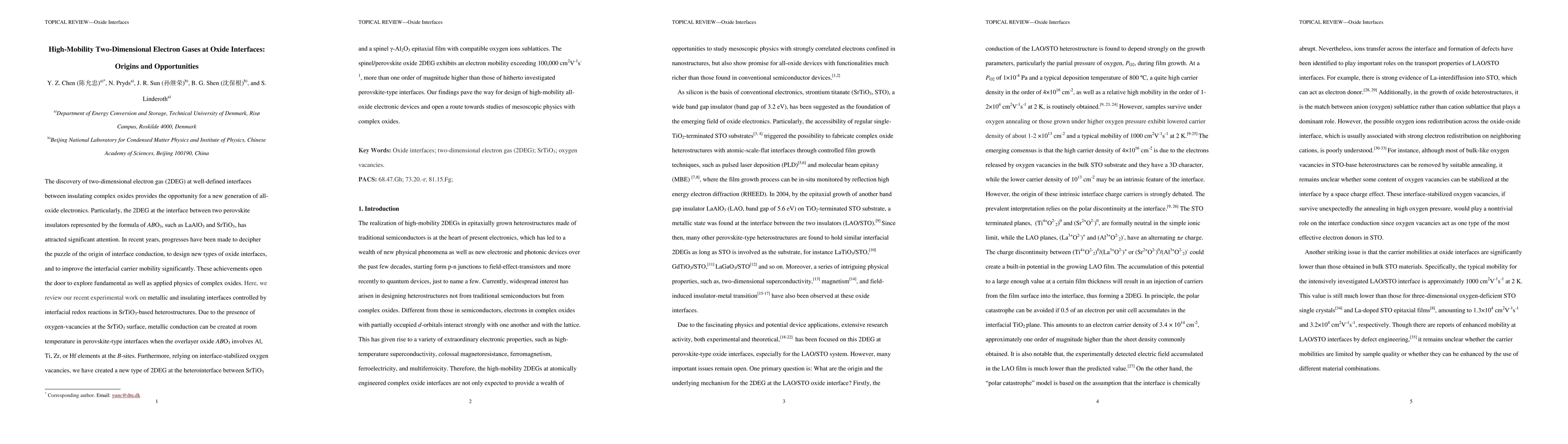The paper reviews recent experimental advancements in creating high-mobility two-dimensional electron gases (2DEGs) at oxide interfaces, specifically at SrTiO3-based heterostructures. These findings reveal that metallic conduction can emerge at room temperature via controlled interfacial redox reactions, achieving electron mobility over 100,000 cm²V⁻¹s⁻¹, significantly surpassing previous perovskite interfaces, thus opening new avenues for all-oxide electronic devices.