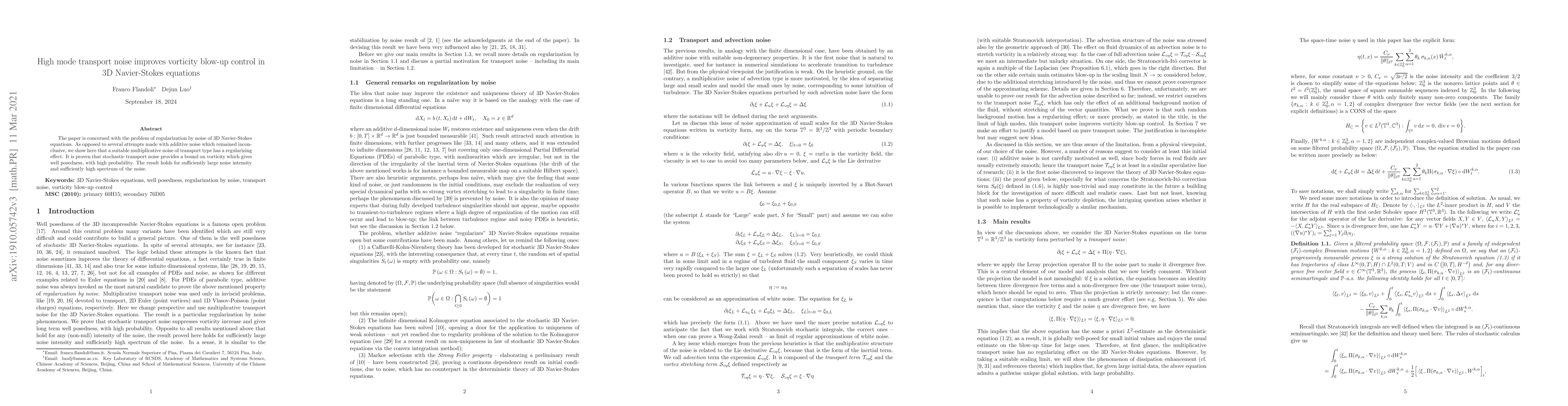 Researchers show that adding a specific type of noise to 3D Navier-Stokes equations can improve control over vorticity blow-up, providing well-posedness with high probability for sufficiently large noise intensity and spectrum.
