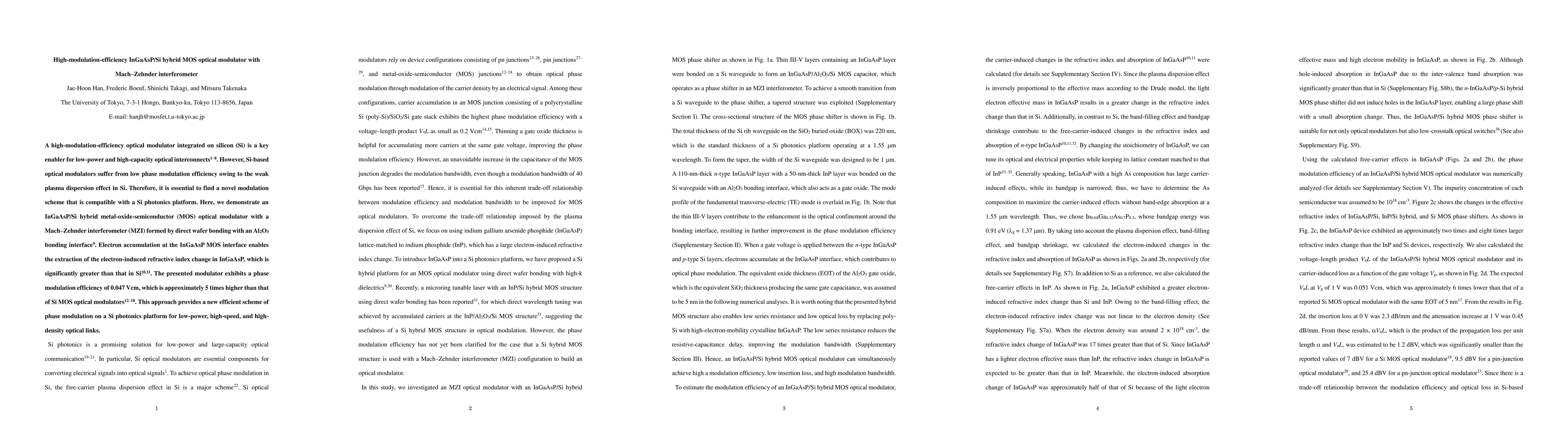 This paper presents a high-modulation-efficiency InGaAsP/Si hybrid MOS optical modulator using a Mach-Zehnder interferometer, achieving a phase modulation efficiency 5 times higher than Si MOS modulators, enabling low-power, high-speed optical interconnects.