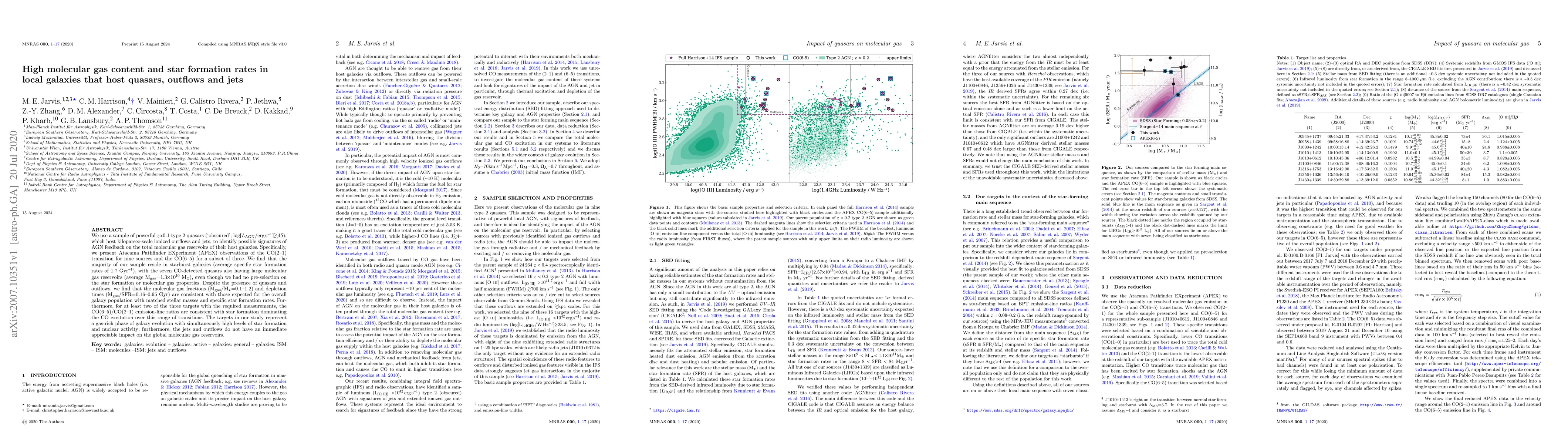 This study investigates the molecular gas content and star formation rates in local galaxies hosting quasars with outflows and jets, finding large molecular gas reservoirs despite AGN activity. The results suggest that AGN feedback does not immediately impact the global molecular gas reservoirs, maintaining gas fractions and depletion times consistent with typical galaxies.