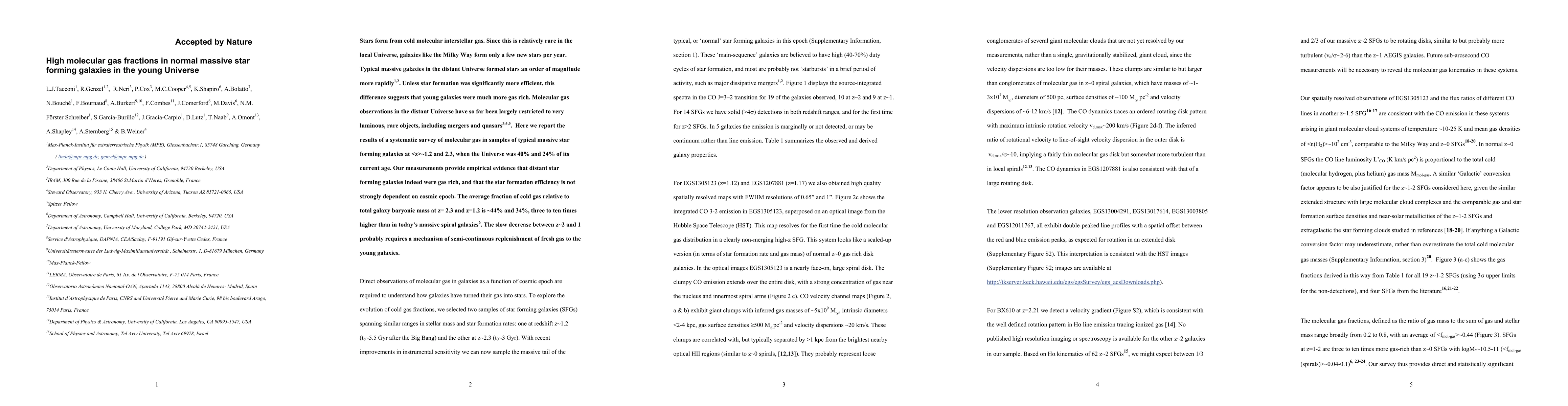 This paper reports a systematic survey of molecular gas in typical massive star-forming galaxies at redshifts of 1.2 and 2.3, revealing that these distant galaxies had significantly higher gas fractions (~44% and 34%) compared to present-day massive spiral galaxies, suggesting star formation efficiency was consistent across cosmic epochs.