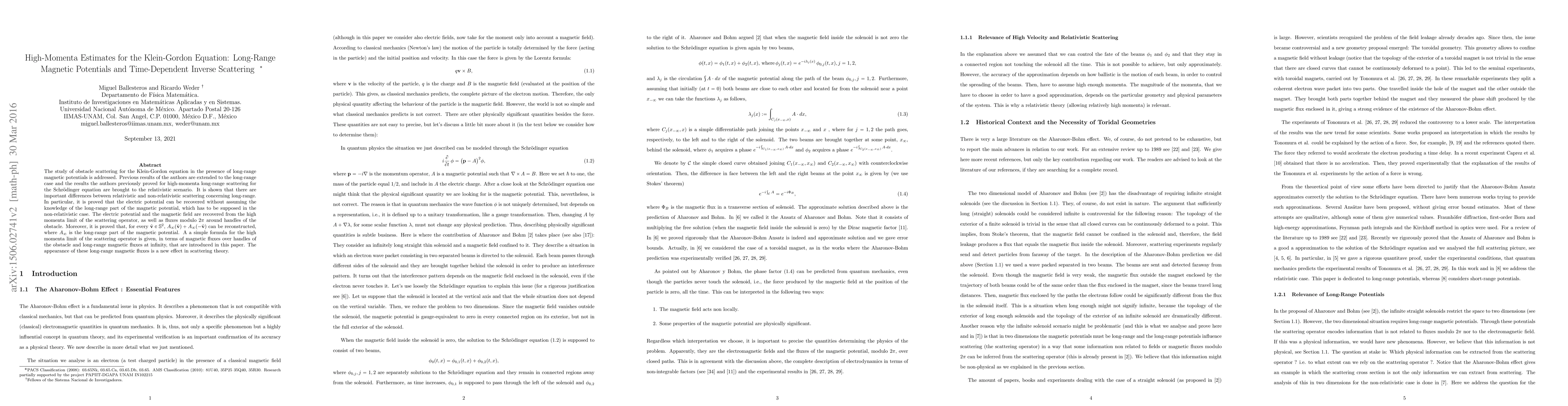 The study of obstacle scattering for the Klein-Gordon equation in the presence of long-range magnetic potentials is addressed. Previous results of the authors are extended to the long-range case and the results the authors previously proved for high-momenta long-range scattering for the Schr\"odinger equation are brought to the relativistic scenario. It is shown that there are important differences between relativistic and non-relativistic scattering concerning long-range. In particular, it is proved that the electric potential can be recovered without assuming the knowledge of the long-range part of the magnetic potential, which has to be supposed in the non-relativistic case. The electric potential and the magnetic field are recovered from the high momenta limit of the scattering operator, as well as fluxes modulo $2 \pi $ around handles of the obstacle. Moreover, it is proved that, for every $\hat{\mathbf v} \in \mathbb{S}^2$, $ A_\infty(\hat{\mathbf v}) + A_\infty(-\hat{\mathbf v})$ can be reconstructed, where $A_\infty$ is the long-range part of the magnetic potential. A a simple formula for the high momenta limit of the scattering operator is given, in terms of magnetic fluxes over handles of the obstacle and long-range magnetic fluxes at infinity, that are introduced in this paper. The appearance of these long-range magnetic fluxes is a new effect in scattering theory.