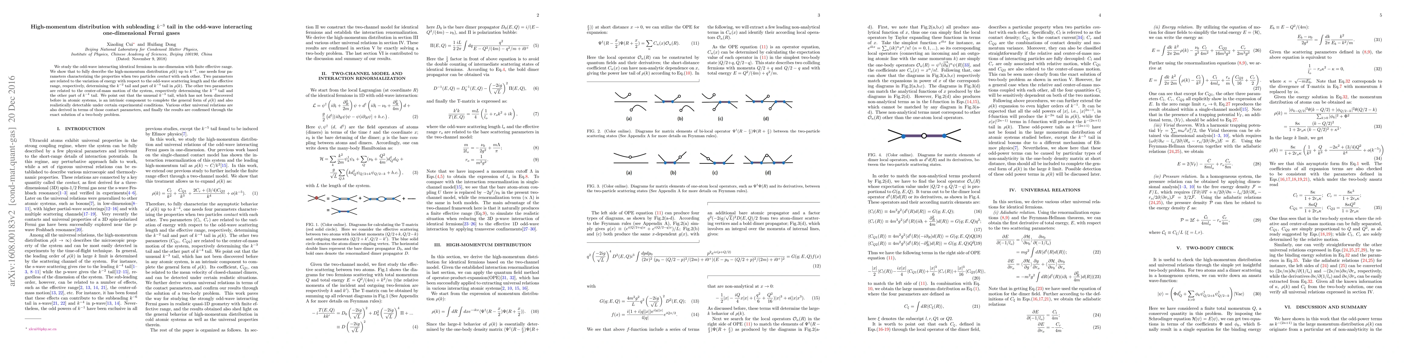 We study the odd-wave interacting identical fermions in one-dimension with finite effective range. We show that to fully describe the high-momentum distribution $\rho(k)$ up to $k^{-4}$, one needs four parameters characterizing the properties when two particles {\it contact} with each other. Two parameters are related to the variation of energy with respect to the odd-wave scattering length and the effective range, respectively, determining the $k^{-2}$ tail and part of $k^{-4}$ tail in $\rho(k)$. The other two parameters are related to the center-of-mass motion of the system, respectively determining the $k^{-3}$ tail and the other part of $k^{-4}$ tail. We point out that the unusual $k^{-3}$ tail, which has not been discovered before in atomic systems, is an intrinsic component to complete the general form of $\rho(k)$ and also realistically detectable under certain experimental conditions. Various other universal relations are also derived in terms of those contact parameters, and finally the results are confirmed through the exact solution of a two-body problem.