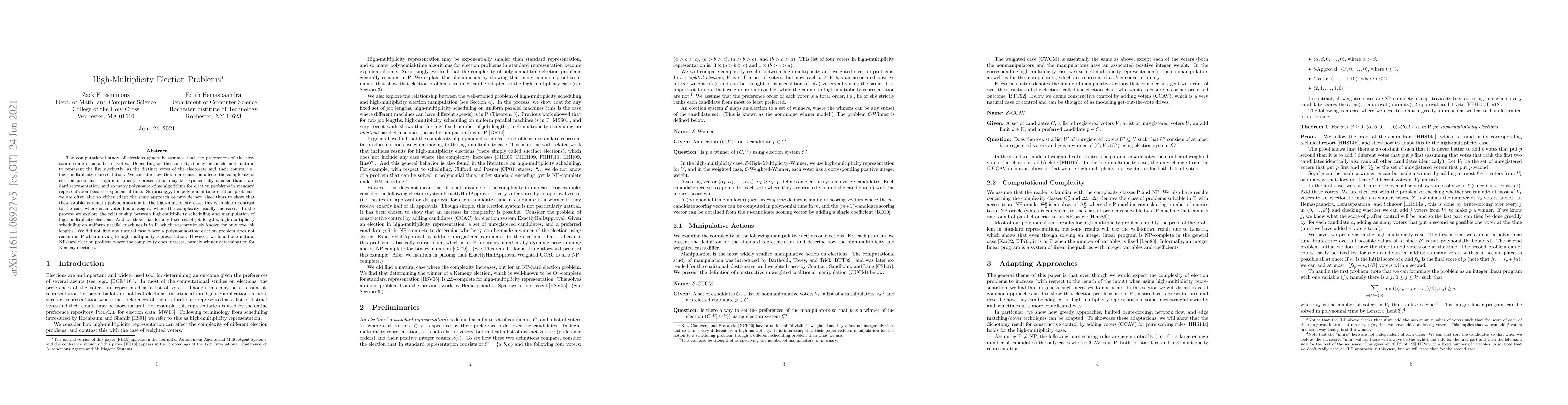 The paper analyzes election problems under high-multiplicity representation, comparing their complexity with standard representation using computational methods.