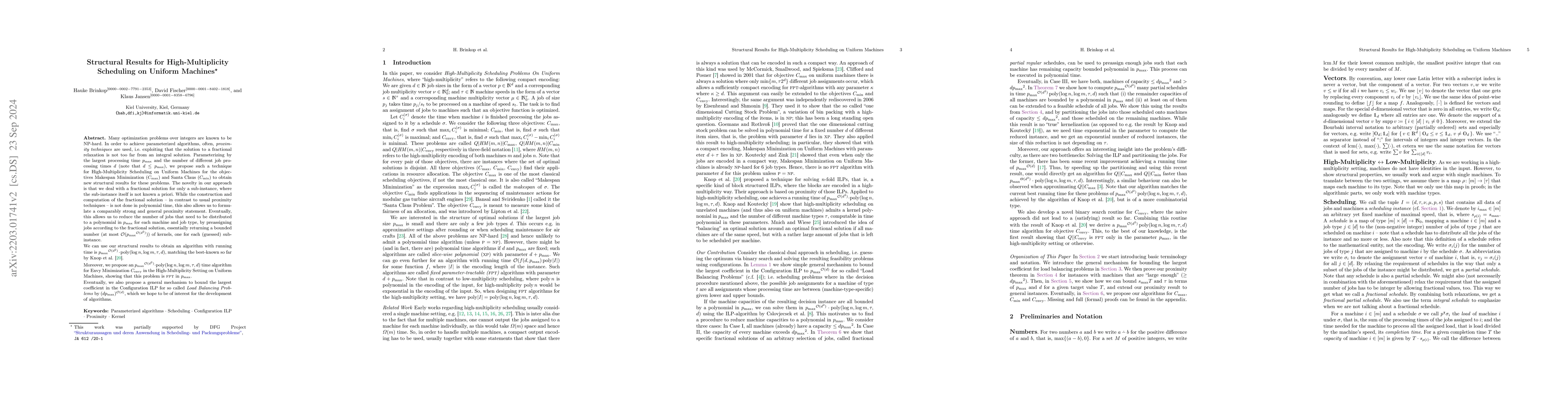 In high-multiplicity scheduling, jobs of the same size are encoded in an efficient way, that is, for each size the number of jobs of that size is given instead of a list of jobs. Similarly, machines are encoded. We consider scheduling on uniform machines where a job of size $p_j$ takes time $p_j/s_i$ on a machine of speed $s_i$. Classical (NP-hard) objectives are Makespan minimization ($C_{\max}$) and Santa Claus ($C_{\min}$). We show that both objectives can be solved in time $\mathcal O( p_{\max}^{\mathcal O(d^2)} \operatorname {poly} |I| )$ where $p_{\max}$ is the largest jobs size, $d$ the number of different job sizes and $|I|$ the encoding length of the instance. Our approach incorporates two structural theorems: The first allows us to replace machines of large speed by multiple machines of smaller speed. The second tells us that some fractional assignments can be used to reduce the instance significantly. Using only the first theorem, we show some additional results. For the problem Envy Minimization ($C_{\mathit{envy}}$), we propose an $\mathcal O(s_{\max} \cdot p_{\max}^{\mathcal O(d^3)} \operatorname{poly} |I|)$ time algorithm (where $s_{\max}$ is the largest speed). For $C_{\max}$ and $C_{\min}$ in the Restricted Assignment setting, we give an $\mathcal O( (d p_{\max})^{\mathcal O(d^3)} \operatorname{poly} |I|)$ time algorithm. As far as we know, those running times are better than the running times of the algorithms known until today.