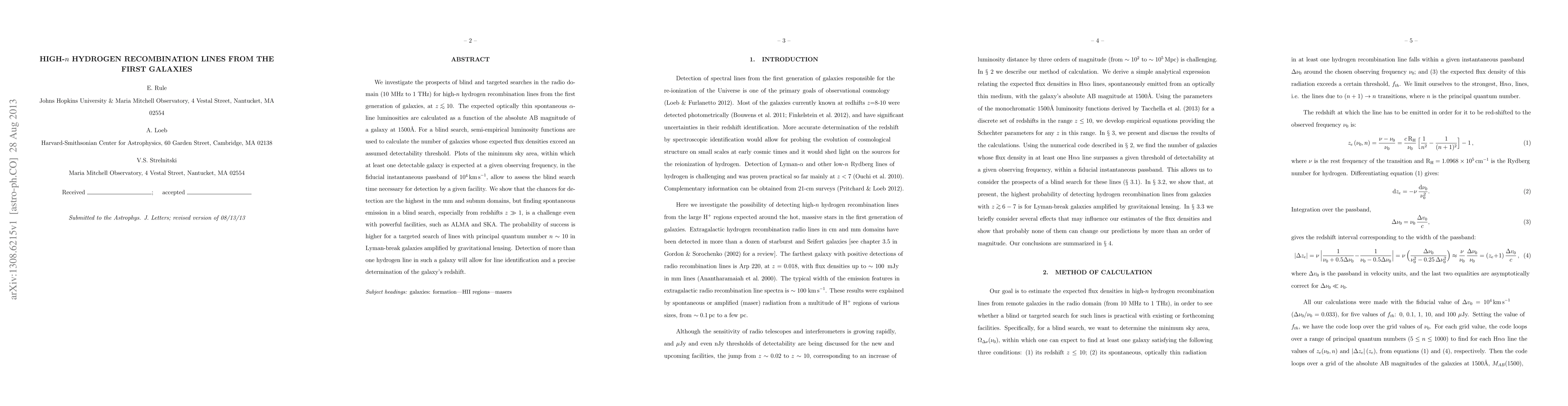 This paper explores the potential for detecting high-n hydrogen recombination lines from the first galaxies using radio observations, finding that while blind searches are challenging, targeted searches, especially for lines amplified by gravitational lensing, offer higher detection probabilities. The study highlights the importance of observing in the mm and submm domains for the best chances of success.