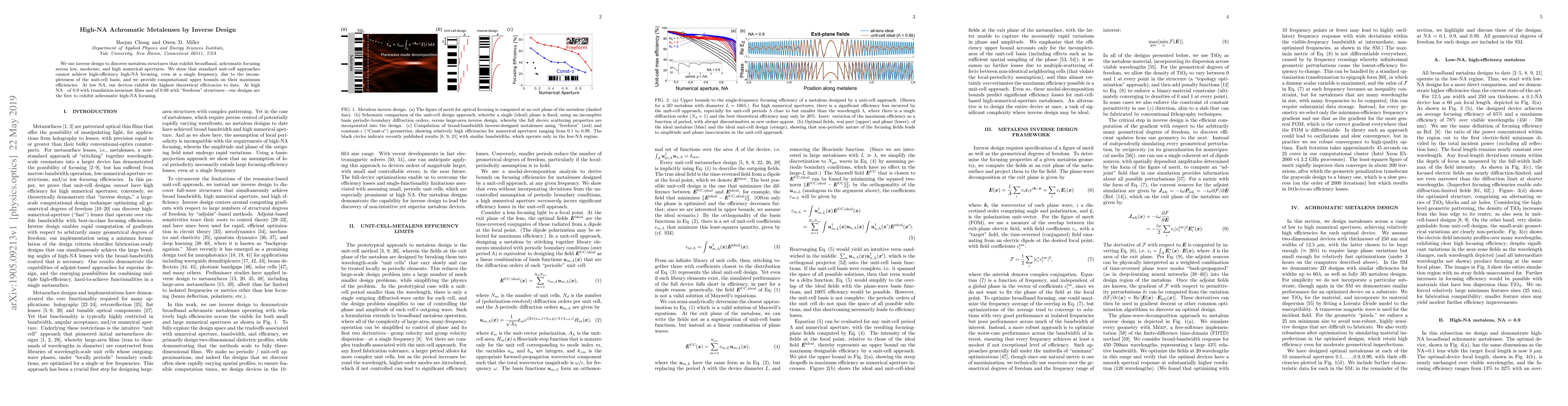 We use inverse design to discover metalens structures that exhibit broadband, achromatic focusing across low, moderate, and high numerical apertures. We show that standard unit-cell approaches cannot achieve high-efficiency high-NA focusing, even at a single frequency, due to the incompleteness of the unit-cell basis, and we provide computational upper bounds on their maximum efficiencies. At low NA, our devices exhibit the highest theoretical efficiencies to date. At high NA -- of 0.9 with translation-invariant films and of 0.99 with "freeform" structures -- our designs are the first to exhibit achromatic high-NA focusing.