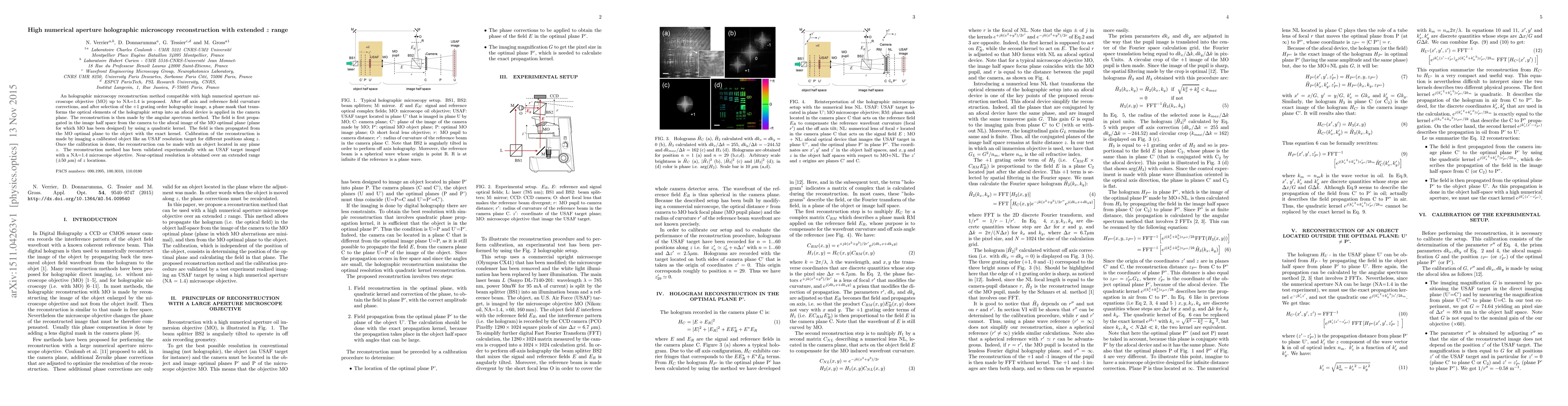 An holographic microscopy reconstruction method compatible with high numerical aperture microscope objective (MO) up to NA=1.4 is proposed. After off axis and reference field curvature corrections, and after selection of the +1 grating order holographic image, a phase mask that transforms the optical elements of the holographic setup into an afocal device is applied in the camera plane. The reconstruction is then made by the angular spectrum method. The field is first propagated in the image half space from the camera to the afocal image of the MO optimal plane (plane for which MO has been designed) by using a quadratic kernel. The field is then propagated from the MO optimal plane to the object with the exact kernel. Calibration of the reconstruction is made by imaging a calibrated object like an USAF resolution target for different positions along $z$. Once the calibration is done, the reconstruction can be made with an object located in any plane $z$. The reconstruction method has been validated experimentally with an USAF target imaged with a NA=1.4 microscope objective. Near-optimal resolution is obtained over an extended range ($\pm 50~\mu$m) of $z$ locations.