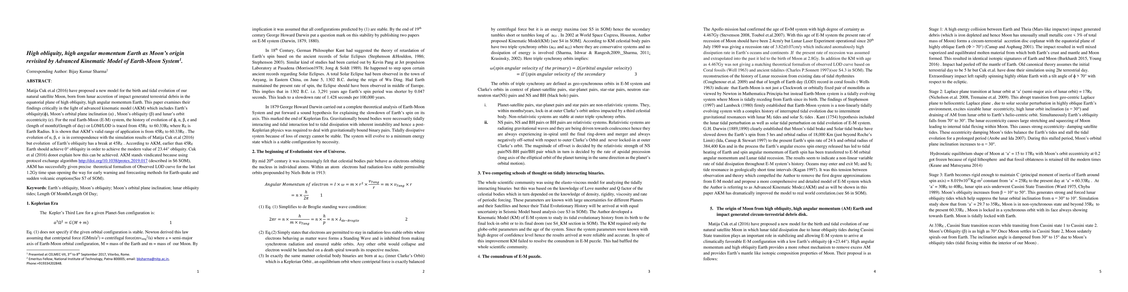 Matija Cuk et.al (2016) have proposed a new model for the birth and tidal evolution of our natural satellite Moon, born from impact generated terrestrial debris in the equatorial plane of high obliquity, high angular momentum Earth. This paper examines their findings critically in the light of advanced kinematic model (AKM) which includes Earth's obliquity (\phi), Moon's orbital plane inclination (\alpha) , Moon's obliquity (\beta) and lunar's orbit eccentricity (e). For the real Earth-Moon (E-M) system, the history of evolution of \phi, \alpha, \beta, e and (length of month)/(length of day) or LOM/LOD is traced from 45R_{E} to 60.33R_{E} where R_{E} is Earth Radius. It is shown that AKM's valid range of application is from 45R_{E} to 60.33R_{E} . The evolution of {\alpha}, \beta, e is in correspondence with the simulation results of Matija Cuk et.al (2016) but evolution of Earth's obliquity has a break at 45R_{E} . According to AKM , earlier than 45RE Earth should achieve zero degree obliquity in order to achieve the modern value of 23.44{\deg} obliquity. Cuk et al (2016) do not explain how this can be achieved.AKM stands vindicated because using protocol exchange algorithm (described in S6 SOM), AKM has successfully given precise theoretical formalism of Observed LOD curve for the last 1.2Gy time span opening the way for early warning and forecasting methods for Earth-quake and sudden volcanic eruptions(See S7 of SOM).