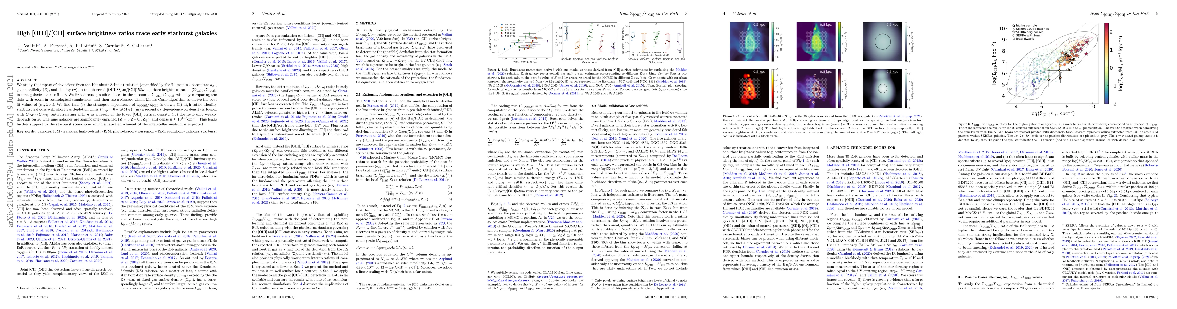 We study the impact of deviations from the Kennicutt-Schmidt relation (quantified by the `burstiness' parameter $\kappa_s$), gas metallicity ($Z$), and density ($n$) on the observed [OIII]88$\mu$m/[CII]158$\mu$m surface brightness ratios ($\Sigma_{[OIII]}/\Sigma_{[CII]}$) in nine galaxies at $z\approx6-9$. We first discuss possible biases in the measured $\Sigma_{[OIII]}/\Sigma_{[CII]}$ ratios by comparing the data with zoom-in cosmological simulations, and then use a Markov Chain Monte Carlo algorithm to derive the best fit values of ($\kappa_s, Z, n$). We find that (i) the strongest dependence of $\Sigma_{[OIII]}/\Sigma_{[CII]}$ is on $\kappa_s$; (ii) high ratios identify starburst galaxies with short gas depletion times ($t_{dep}=6-49\,\rm Myr$); (iii) a secondary dependence on density is found, with $\Sigma_{[OIII]}/\Sigma_{[CII]}$ anticorrelating with $n$ as a result of the lower [OIII] critical density, (iv) the ratio only weakly depends on $Z$. The nine galaxies are significantly enriched (Z=0.2-0.5 $Z_\odot$), and dense ($n=10^{1-3} {\rm cm}^{-3}$). This lends further support to the starburst scenario in which a rapid enrichment of the interstellar medium is expected.