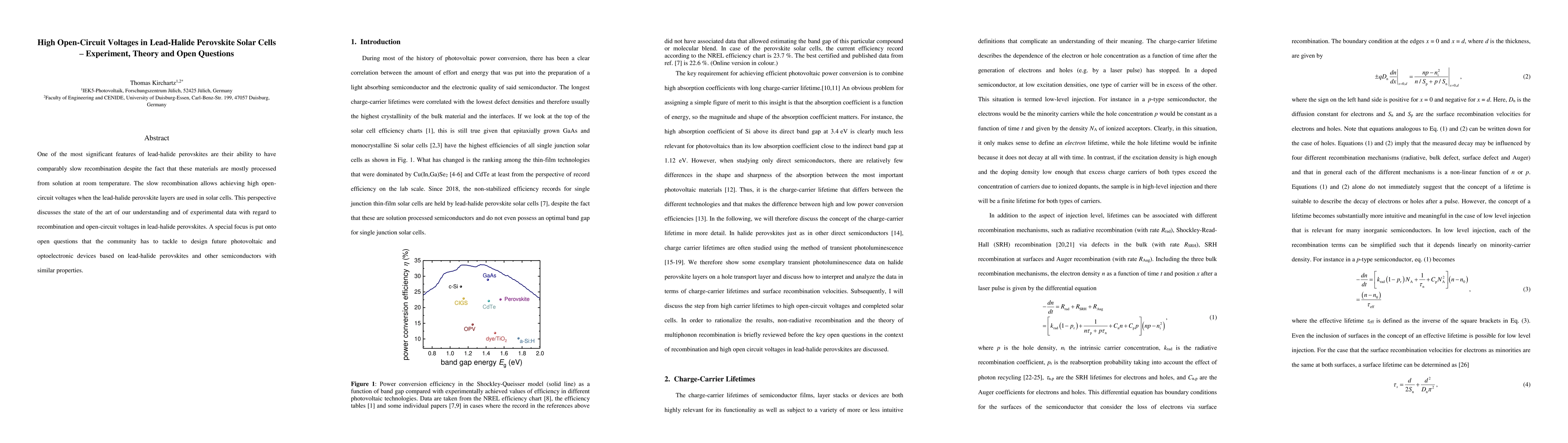 This paper explores the remarkable high open-circuit voltages in lead-halide perovskite solar cells, attributing them to the slow recombination rates of these materials processed at room temperature. It highlights the current understanding and experimental data on recombination and poses critical open questions for future advancements in photovoltaic and optoelectronic devices.