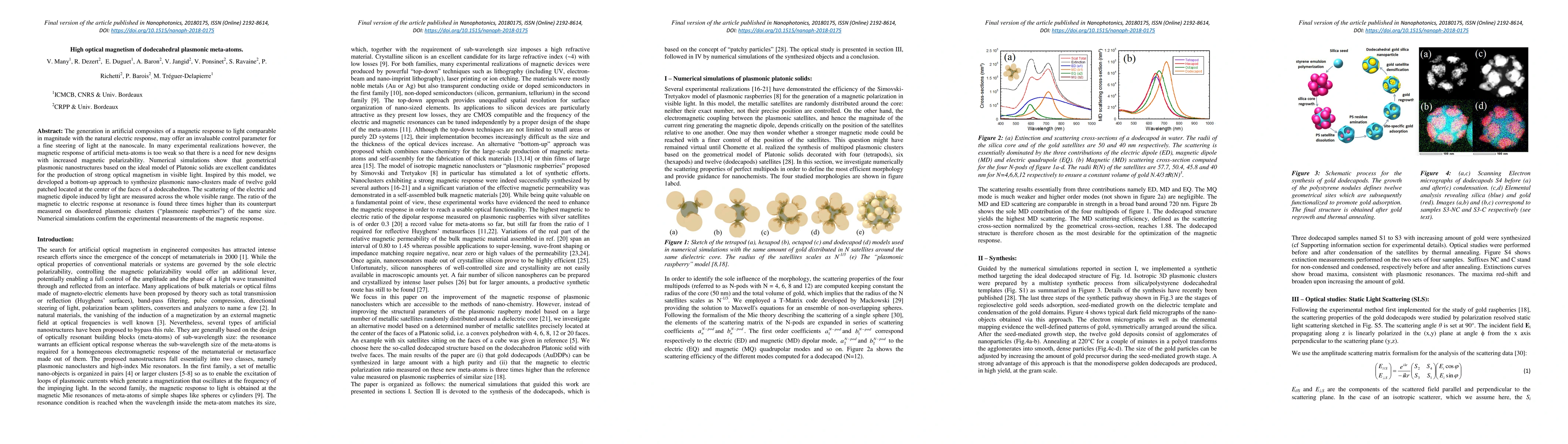 This paper reports the synthesis of dodecahedral plasmonic meta-atoms using gold patches, which exhibit significantly higher optical magnetism compared to disordered plasmonic clusters. The study demonstrates a threefold increase in the magnetic to electric response ratio, validated by both experimental measurements and numerical simulations.