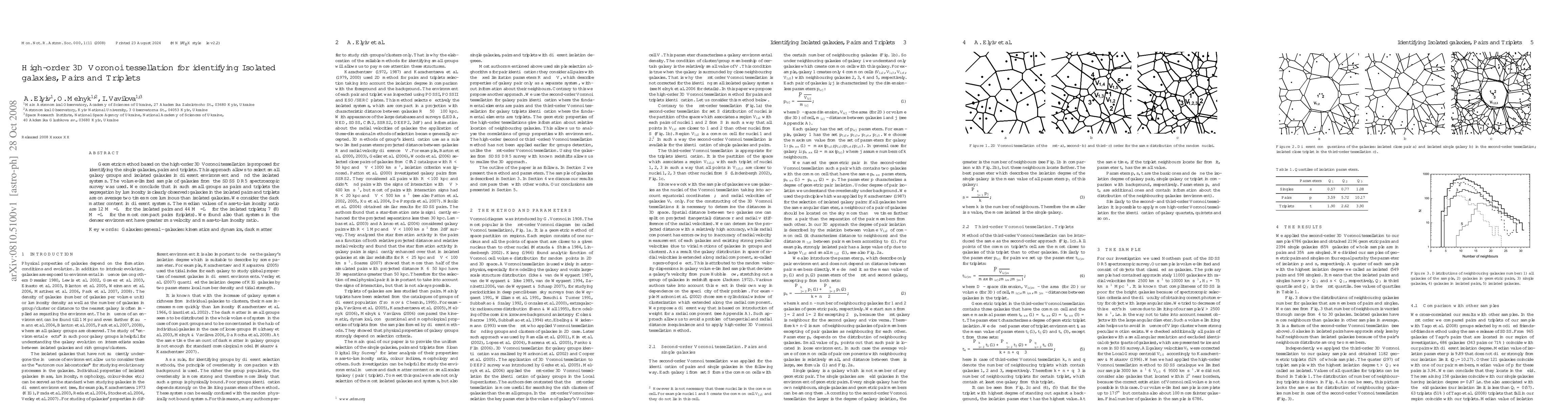 This paper proposes a high-order 3D Voronoi tessellation method to identify isolated galaxies, pairs, and triplets, using a volume-limited sample from the SDSS DR5 survey. The study finds that galaxies in small groups exhibit luminosity segregation, with pairs and triplets being twice as luminous as isolated galaxies, and discusses the dark matter content and mass-to-luminosity ratios in these systems.