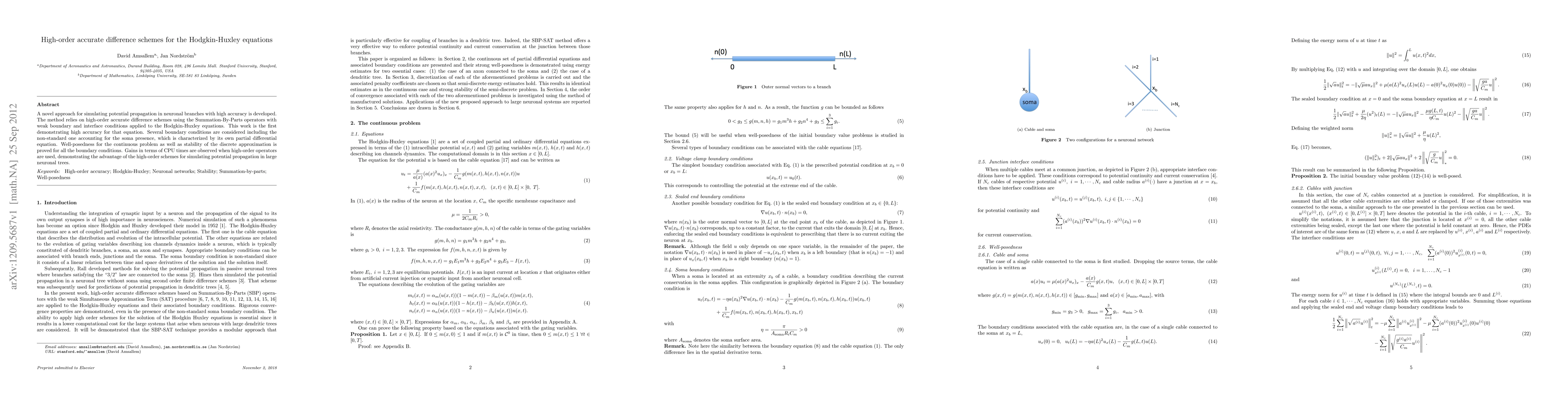 A novel approach for simulating potential propagation in neuronal branches with high accuracy is developed. The method relies on high-order accurate difference schemes using the Summation-By-Parts operators with weak boundary and interface conditions applied to the Hodgkin-Huxley equations. This work is the first demonstrating high accuracy for that equation. Several boundary conditions are considered including the non-standard one accounting for the soma presence, which is characterized by its own partial differential equation. Well-posedness for the continuous problem as well as stability of the discrete approximation is proved for all the boundary conditions. Gains in terms of CPU times are observed when high-order operators are used, demonstrating the advantage of the high-order schemes for simulating potential propagation in large neuronal trees.